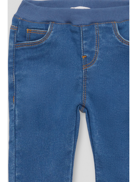 Pantalón en tejido denim elástico de color azul medio, con corte ajustado tipo jegging. Incorpora cinturilla elástica de canalé con cordón decorativo, bolsillos delanteros y traseros simulados, y pespuntes en contraste. Una prenda cómoda y fácil de combinar, perfecta para el día a día.