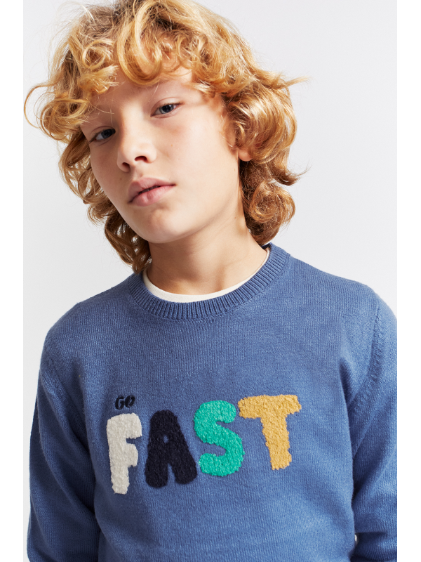 Jersey en color azul petróleo, con diseño frontal de letras en relieve tipo rizo multicolor que forman la palabra “FAST” y pequeño texto bordado “GO”. Cuello redondo, puños y bajo en canalé. Interior perchado, suave y calentito para los días de invierno. Perfecta para dar un toque divertido y urbano a cualquier look del día a día.