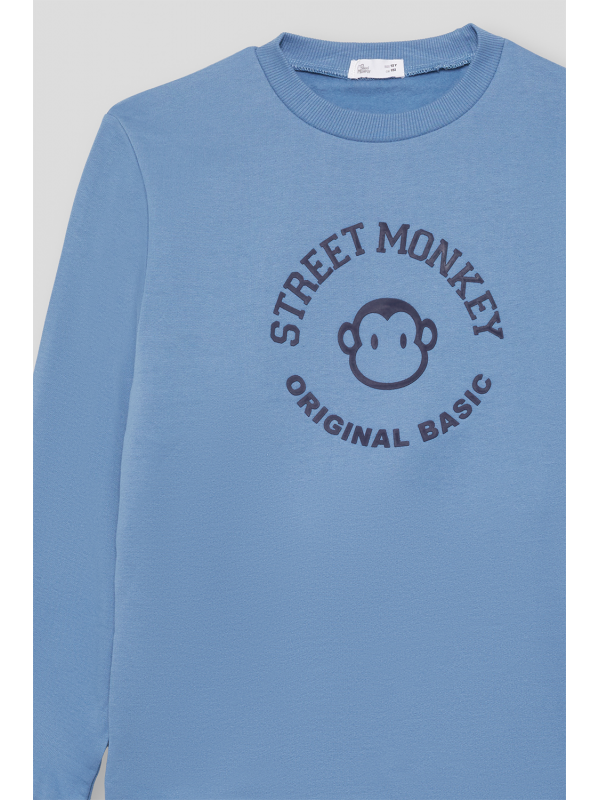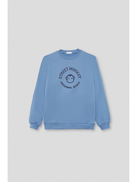 Sudadera para niño de 2 a 16 años disponible en varios colores: azul medio, gris melange, marino y mostaza. Esta sudadera es perfecta para combinar estilo y comodidad en el día a día. Presenta un divertido diseño con el texto "Street Monkey Original Basic" y un simpático mono en el centro, añadiendo un toque de originalidad y diversión al look de cualquier niño.
