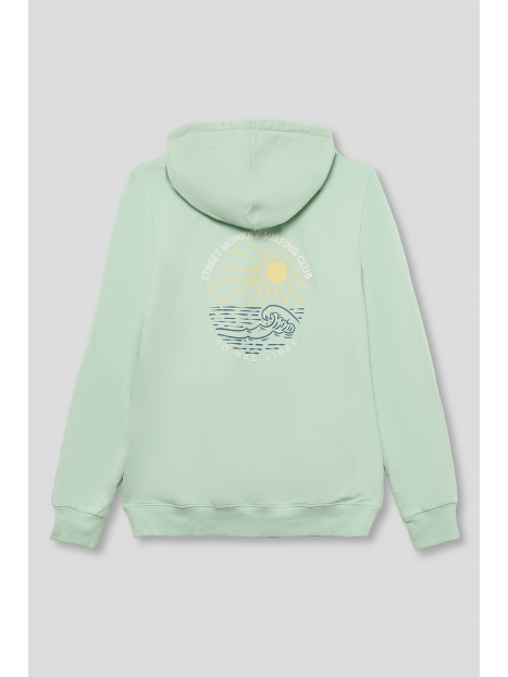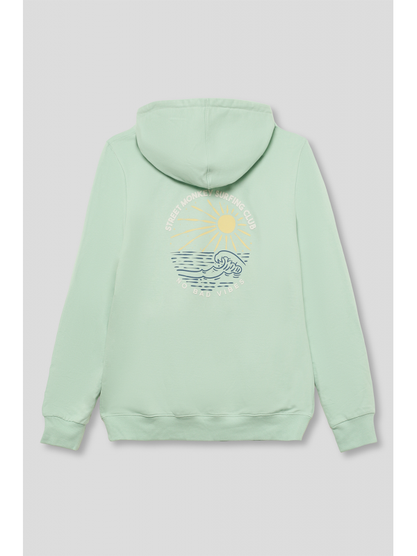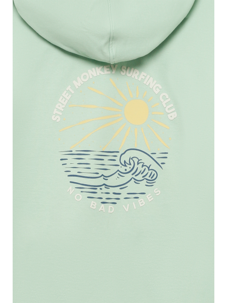 Confeccionada en un tejido suave y ligero, ideal para los días frescos. Cuenta con bolsillo tipo canguro al frente, ajuste de capucha con cordones blancos y mangas con puños acanalados para un ajuste cómodo. Destaca por su diseño minimalista en el frente con un pequeño logo bordado en el pecho y un estampado en la espalda con un gráfico surfero de sol y olas, acompañado de la frase "Street Monkey Surfing Club - No Bad Vibes".