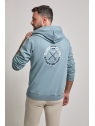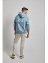 Sudadera con capucha para hombre en color azul empolvado. Diseño liso con bolsillo tipo canguro y pequeño detalle gráfico en el pecho, combinada con estampación trasera de inspiración surf.