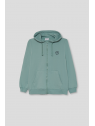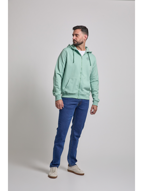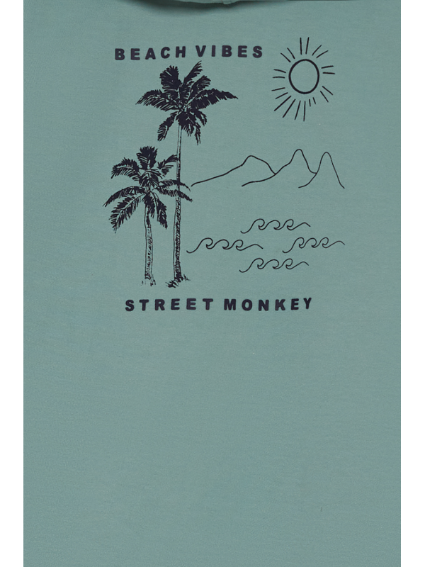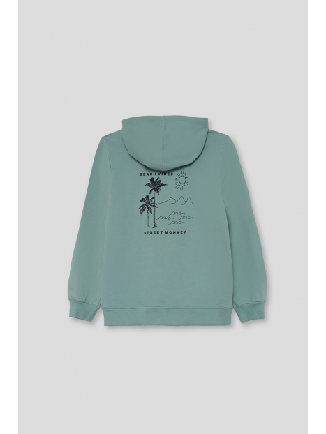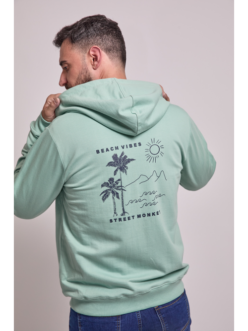 Sudadera con capucha disponible en color verde caribe, en tallas de la S a la 3XXL. Diseño con cremallera frontal, bolsillos tipo canguro y cordón ajustable en la capucha. Detalle de logotipo Street Monkey en el pecho. Tejido de algodón suave y cómodo, ideal para el día a día.