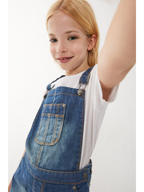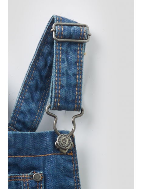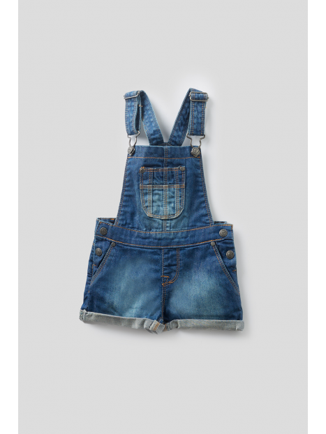Peto denim corto con bolsillo frontal y tirantes con cierre metálicos.