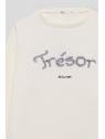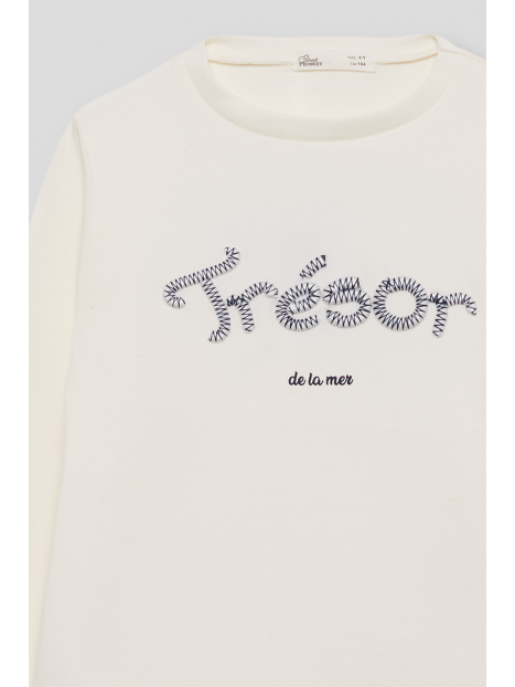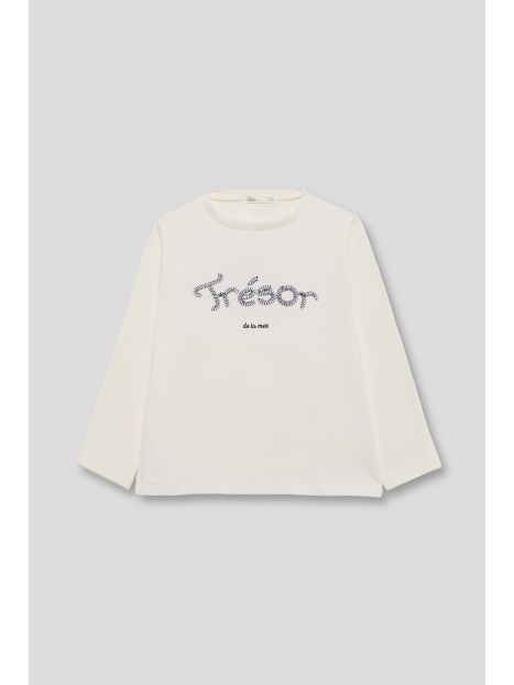 Camiseta en punto liso con cuello redondo y estampado frontal con relieve y texto decorativo “Trésor de la mer” en azul marino. Su diseño minimalista y el suave tejido de algodón la convierten en una prenda versátil y cómoda para el día a día.