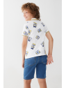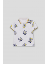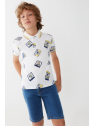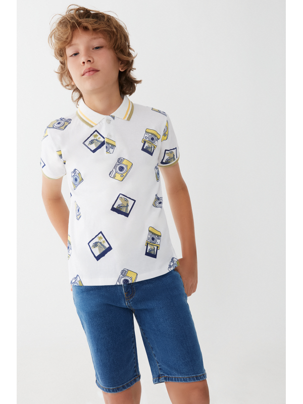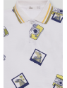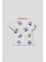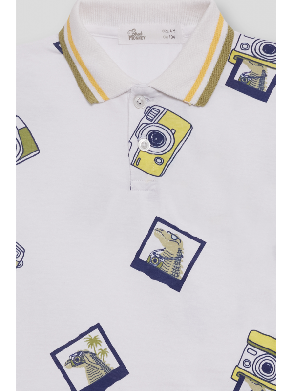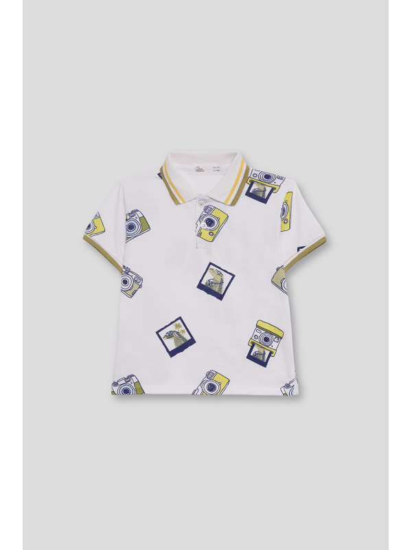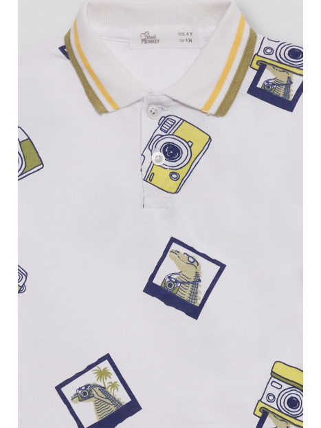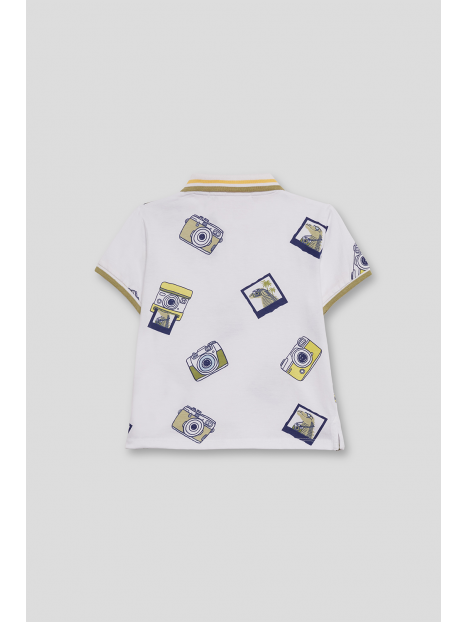 Polo blanco con estampado integral de cámaras vintage y fotografías tropicales en tonos azul marino y amarillo mostaza, aportando un estilo retro y veraniego. El cuello de canalé con franjas en contraste y la tapeta con botones clásicos realzan su diseño sofisticado y casual.