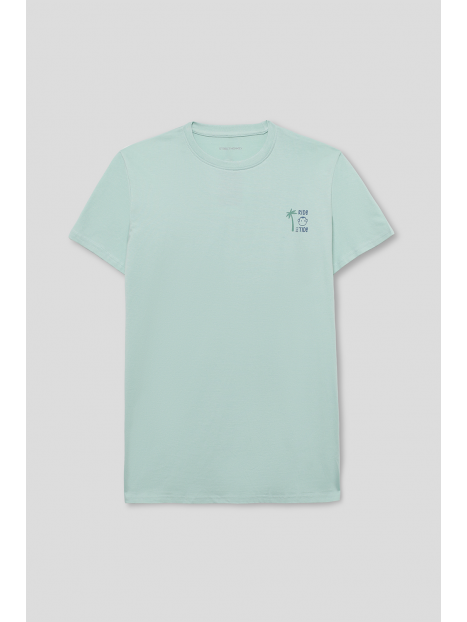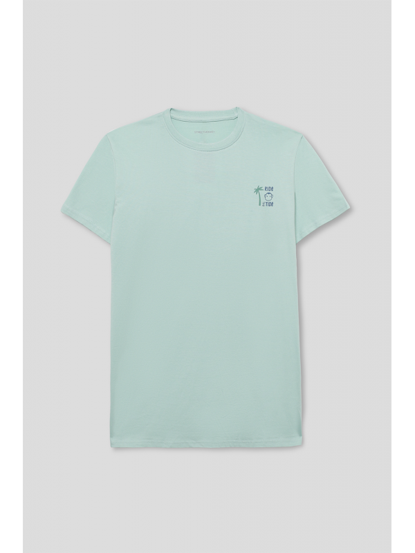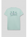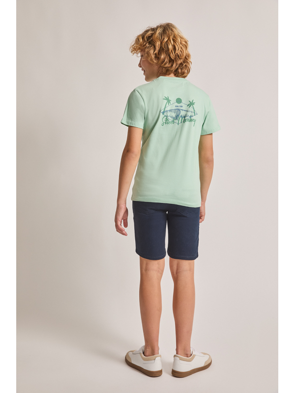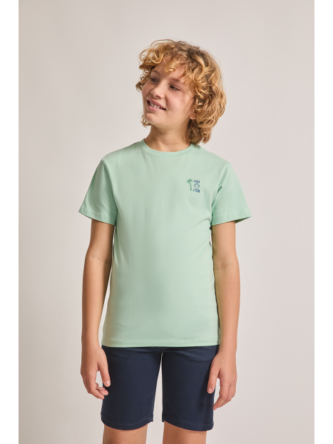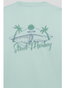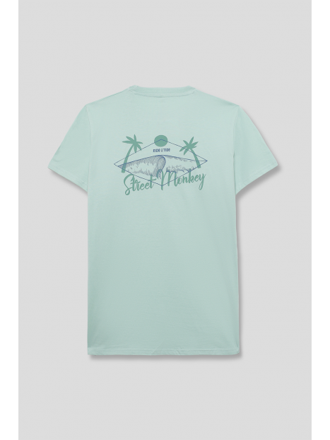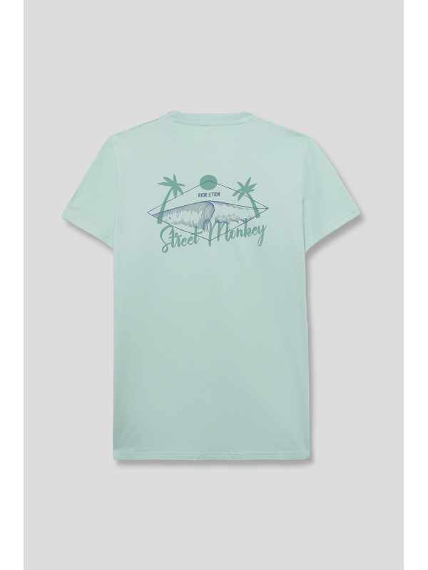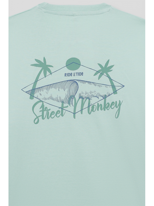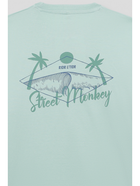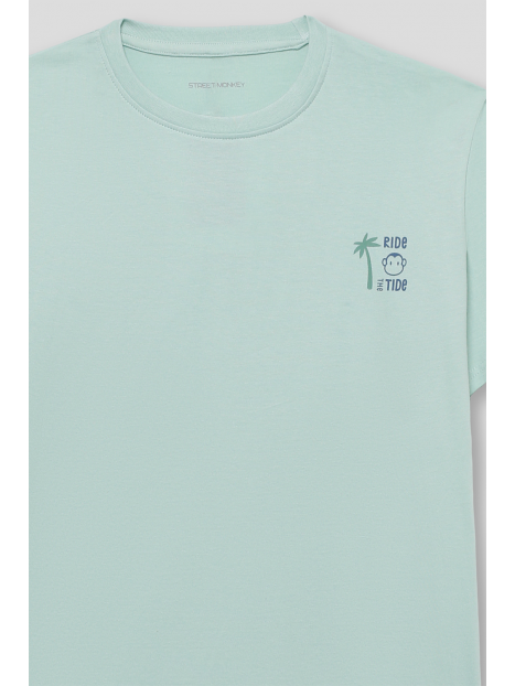 Camiseta en color verde manzana para niño de 2 a 16 años. Diseño de manga corta y cuello redondo en un tono fresco y veraniego. Pequeño estampado en el pecho con palmera y ola, acompañado de la frase Ride the Tide. La parte trasera destaca con un gráfico de inspiración surfera con una tabla de surf, palmeras y el logotipo de Street Monkey en un estilo vintage. Confeccionada en algodón suave y transpirable para máxima comodidad. Ideal para días soleados y aventuras al aire libre. ¡Un básico imprescindible para los pequeños exploradores