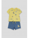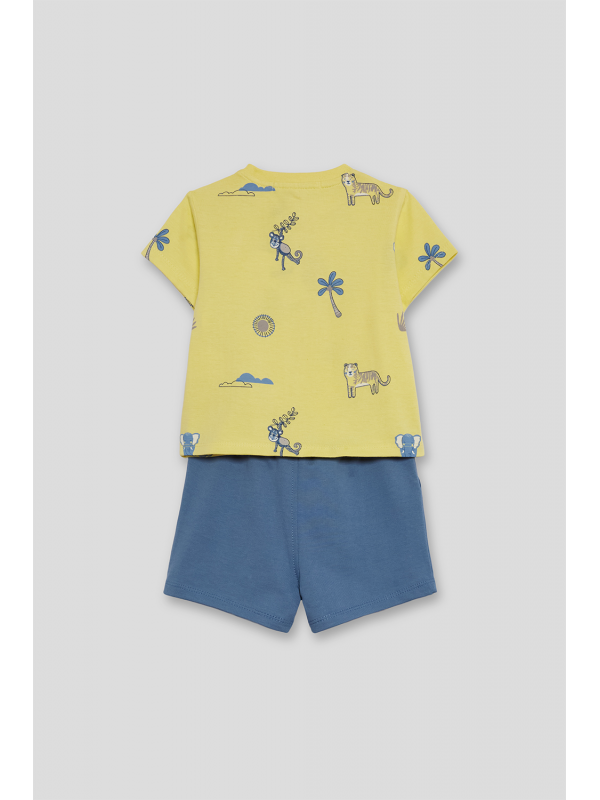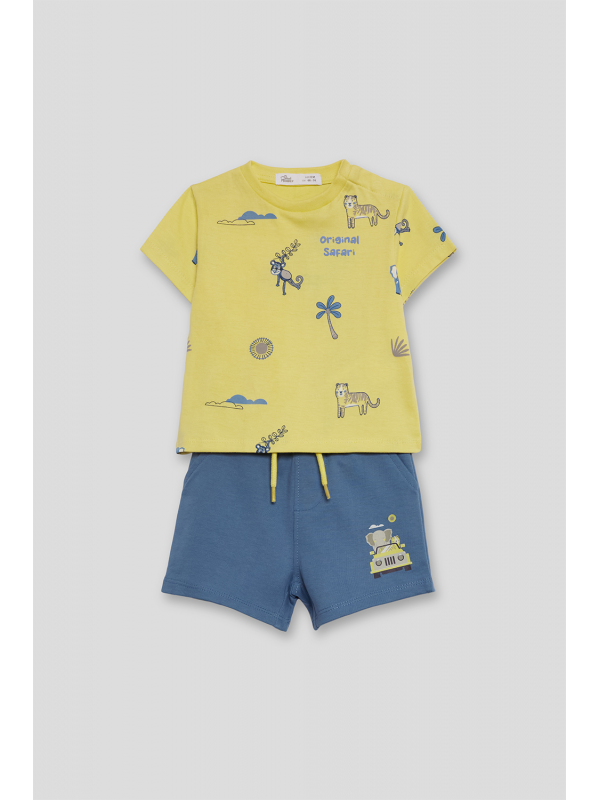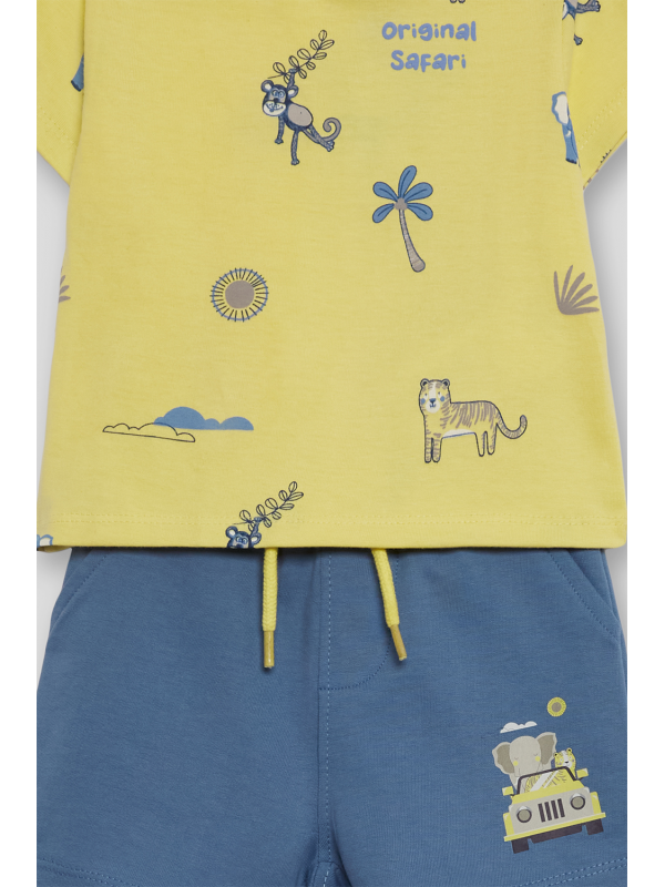 Llena de diversión y aventura cada día con este conjunto vibrante y juguetón, perfecto para un pequeño explorador. La camiseta amarilla está adornada con un alegre estampado de safari que incluye animales y elementos naturales, diseñado para captar la curiosidad de tu hijo. Incluye un cierre de botones en los hombros, diseñado especialmente para facilitar el cambio de ropa a las tallas de meses.