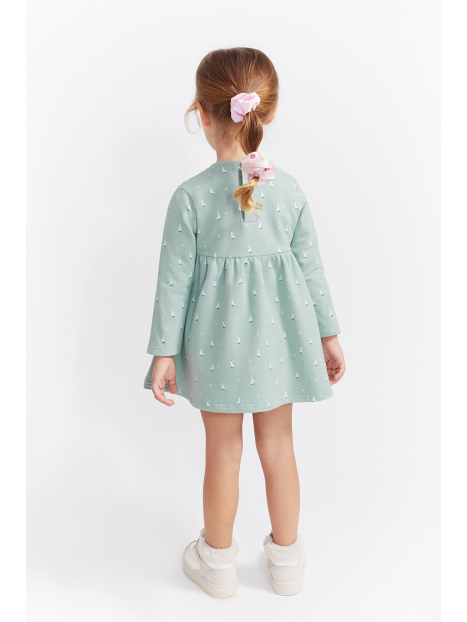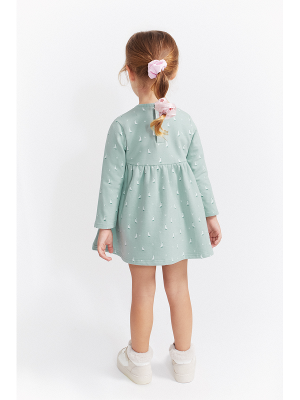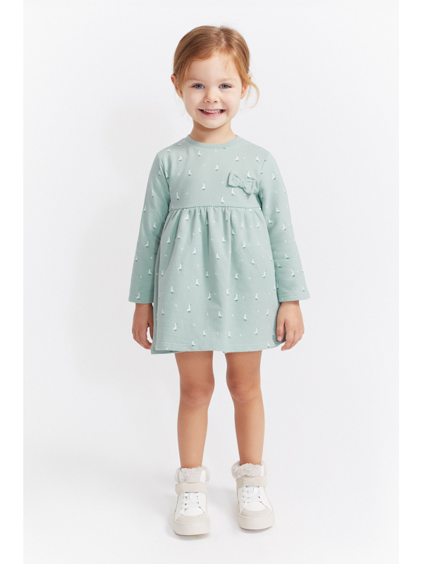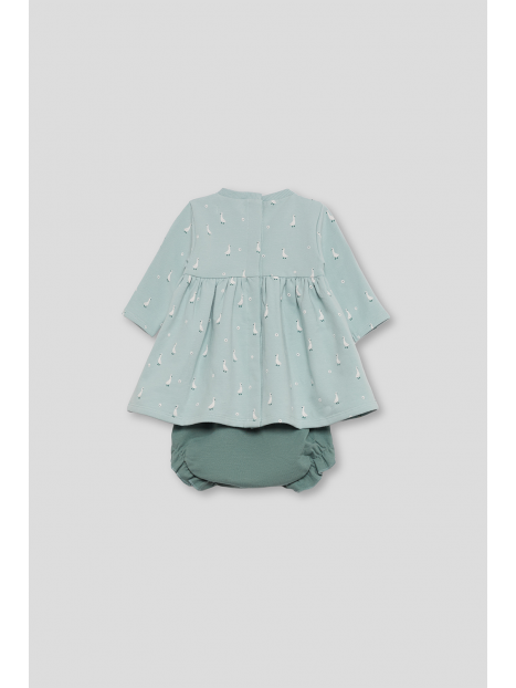 Vestido en color eucalipto con un delicado estampado de pequeños patitos en blanco, ideal para un look tierno y divertido. Presenta un diseño de corte con vuelo y frunce bajo el pecho que aporta amplitud y comodidad, además de un lazo decorativo a tono en el pecho.