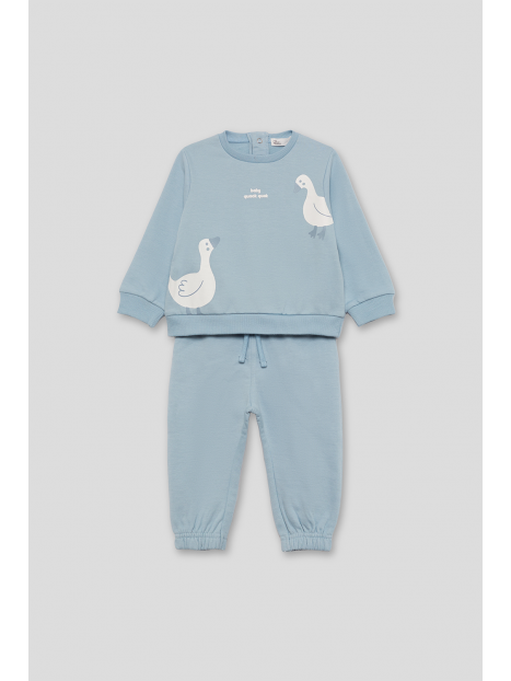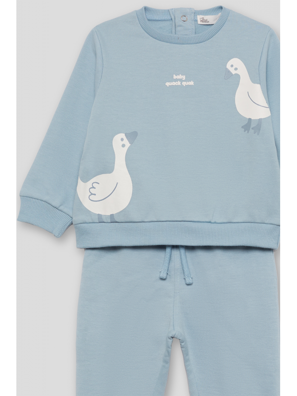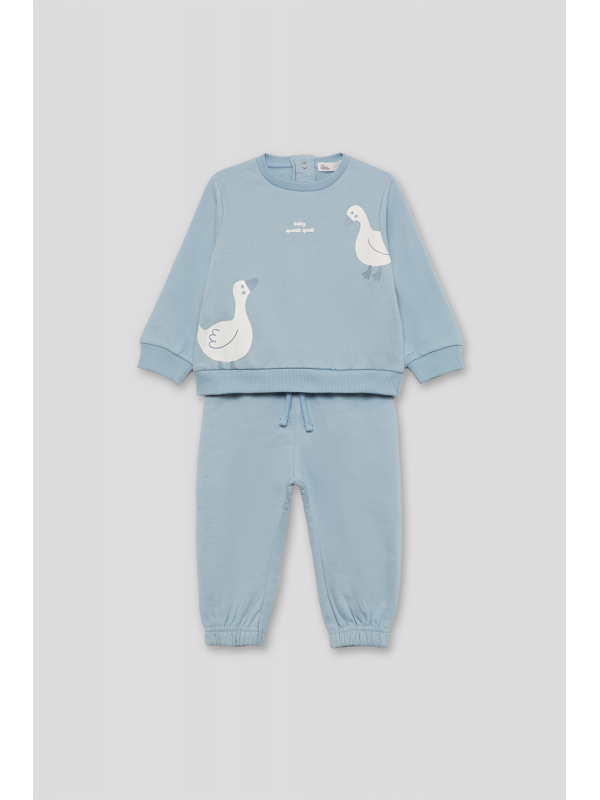 Conjunto de dos piezas afelpado, sudadera y pantalón para bebé niña de 3 meses a 6 años. La sudadera de manga larga presenta un diseño divertido con patitos estampados en la parte delantera y el texto “baby queek queek” en el centro del pecho. El cuello redondo y los acabados de canalé en puños y bajo garantizan un ajuste cómodo. Las tallas de meses incluyen cierre de botones en la espalda para facilitar la puesta. El pantalón a juego tiene cintura elástica y bajo con goma ajustada tipo jogger, proporcionando libertad de movimiento y una mayor sujeción.