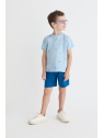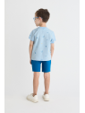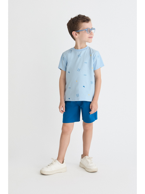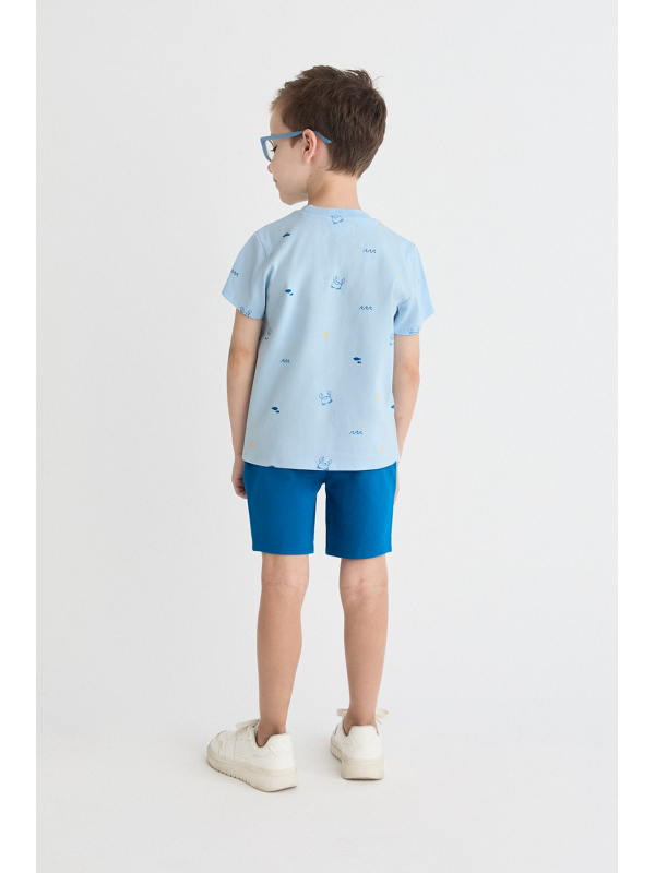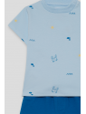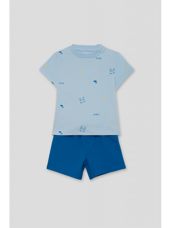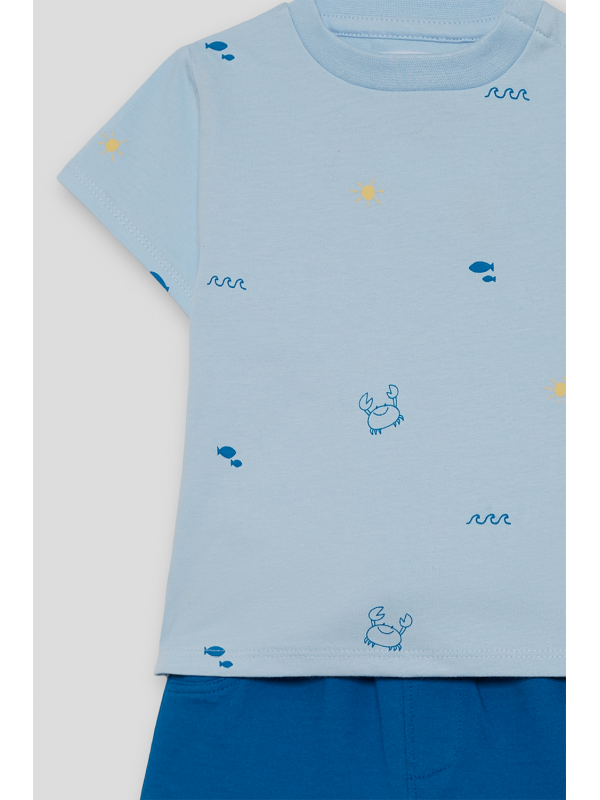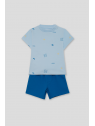 Camiseta de manga corta en color azul claro con estampado de pequeños motivos marinos. Shorts en color azul con cintura elástica para un ajuste cómodo. Un conjunto fresco y práctico, perfecto para los días de verano.