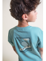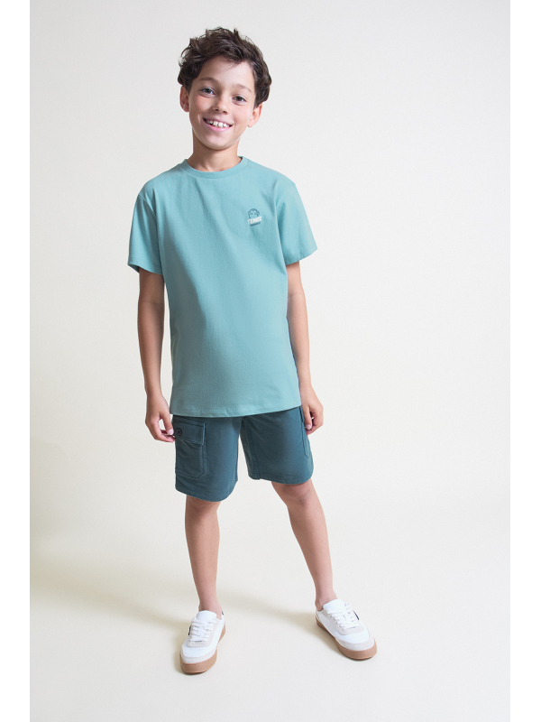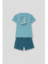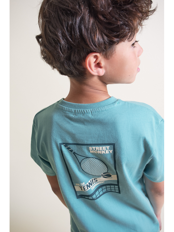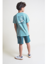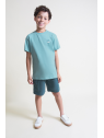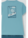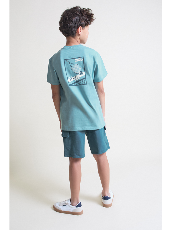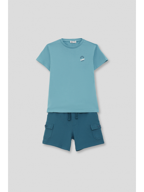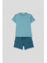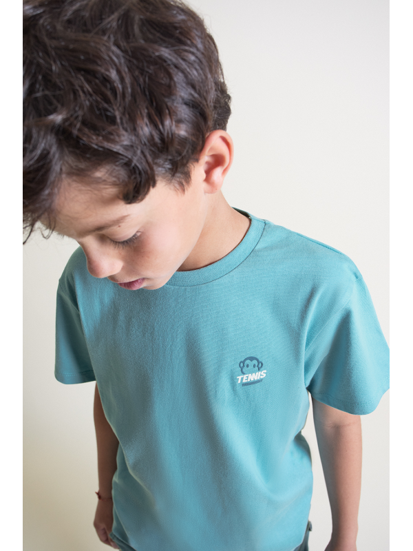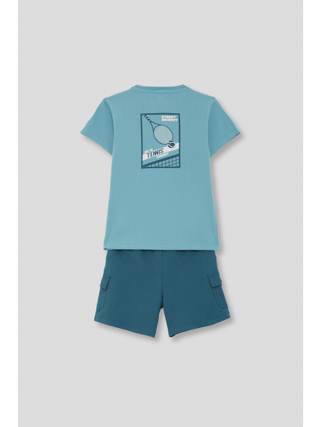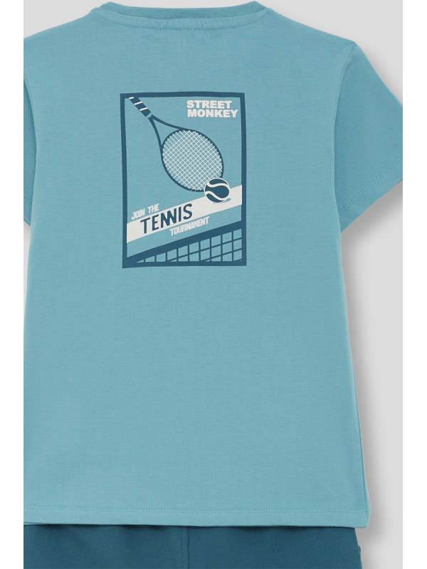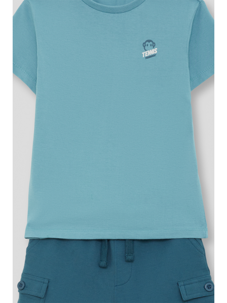 Camiseta en color turquesa con detalle frontal de estampado “Tennis”. Shorts a juego en tono azul con bolsillos laterales y cintura ajustable con cordón. Confeccionado en tejido cómodo y fresco, ideal para el día a día.