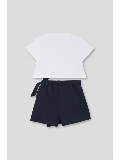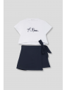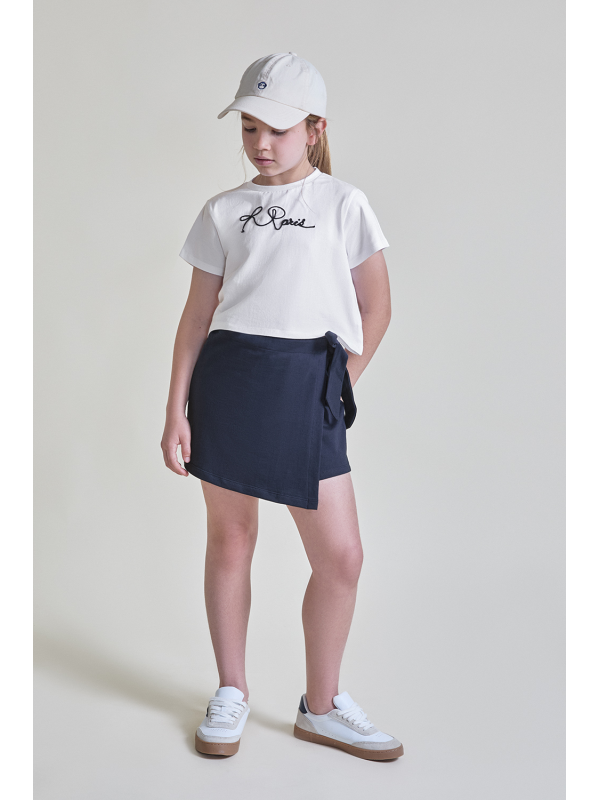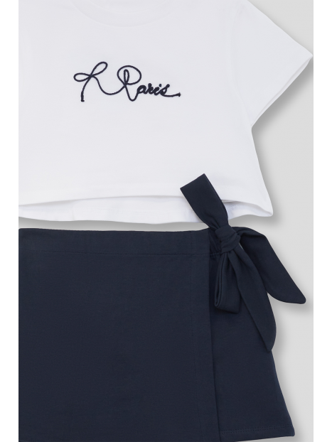 Camiseta blanca con bordado “Paris” y falda-pantalón azul marino con lazo lateral. Diseño moderno, cómodo y perfecto para un look casual con estilo.