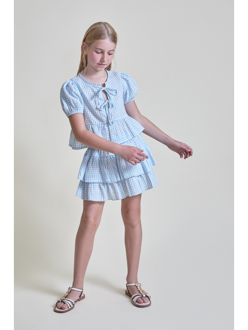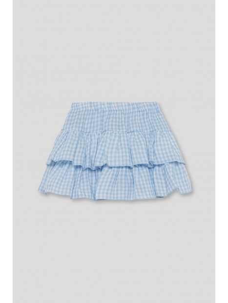 Falda corta para niña de 2 a 16 años en cuadro vichy celeste.
