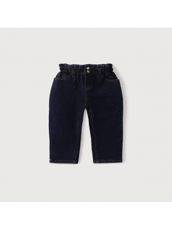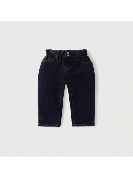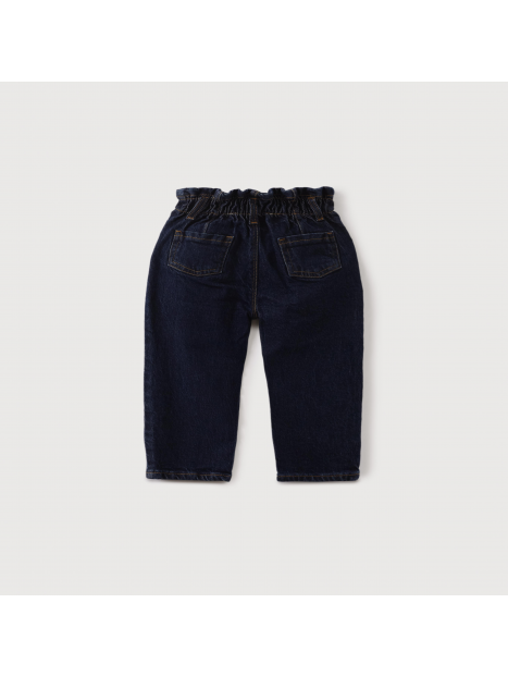 Pantalón con fit ancho elaborado en denim de algodón. La cinturilla elástica proporciona comodidad a la prenda. Tiene cuatro bolsillos, dos delanteros y dos traseros.