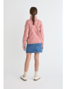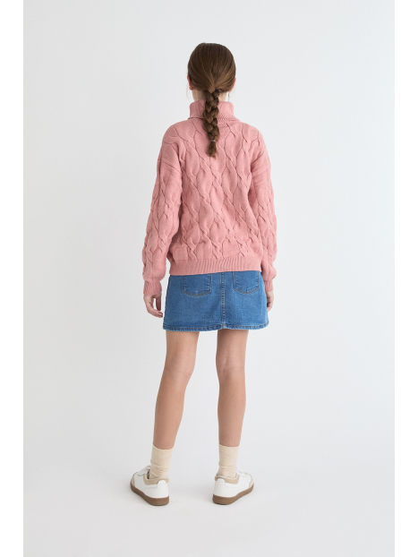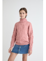 Jersey trenzado con cuello vuelto, disponible en tres colores: celeste, maquillaje y beige. Confeccionado en un cálido punto de tacto suave, presenta diseño de ochos en la parte frontal y mangas, y acabados en canalé en el cuello, puños y bajo. Su corte recto y confortable lo convierte en una prenda ideal para el día a día.