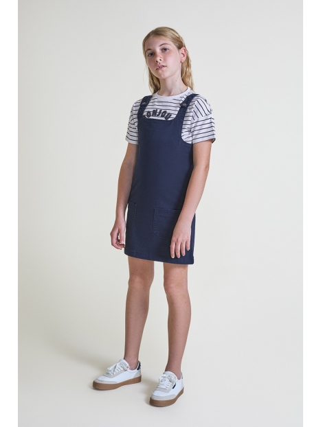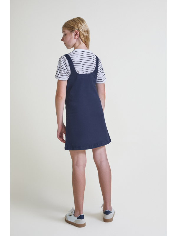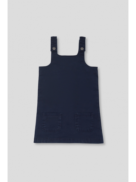 Color marino con tirantes abotonados y bolsillos frontales. Cómodo y versátil, ideal para combinar con camisetas en cualquier ocasión.