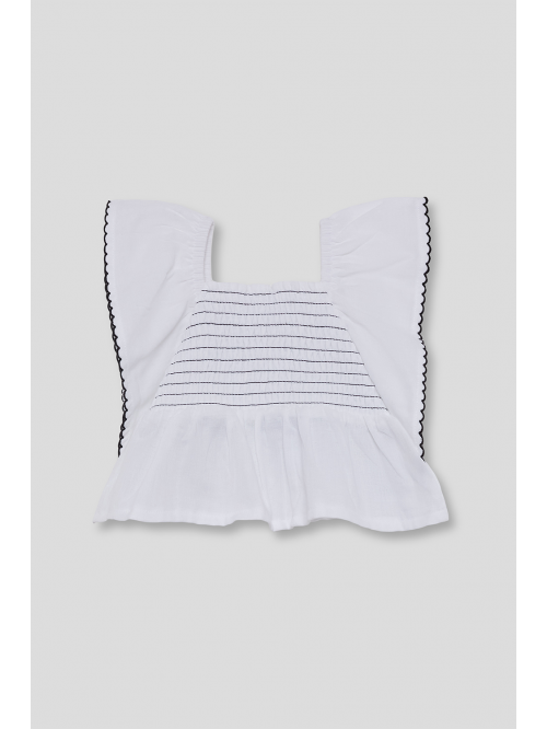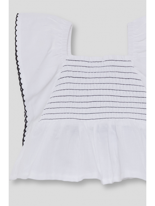 Diseño con cuerpo fruncido, mangas abullonadas y volante en el bajo, ideal para el verano.