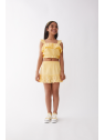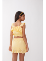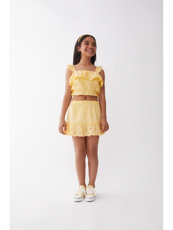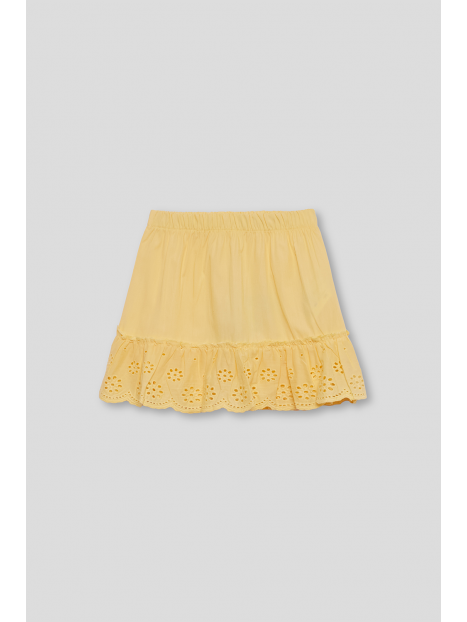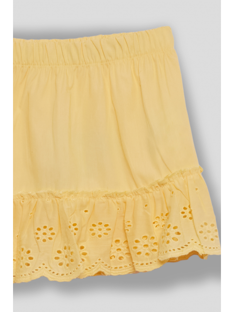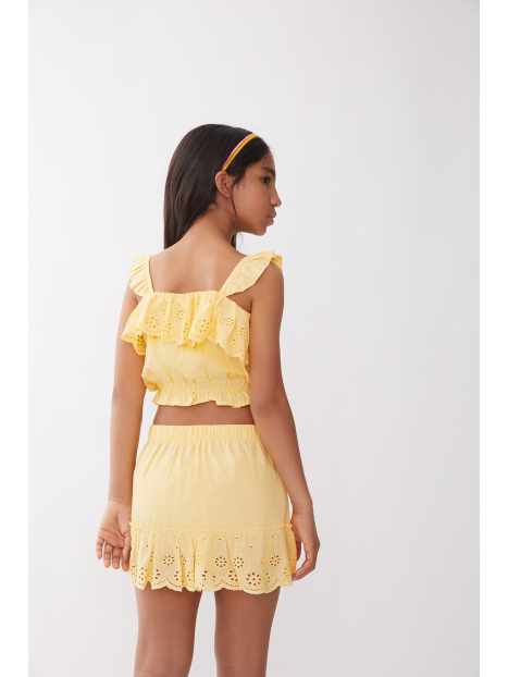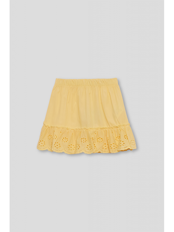 Falda en color maíz con un encantador diseño de bordado calado en el bajo que aporta un toque delicado y veraniego. Su corte con vuelo y el volante decorativo crean una silueta fresca y ligera, perfecta para los días soleados.