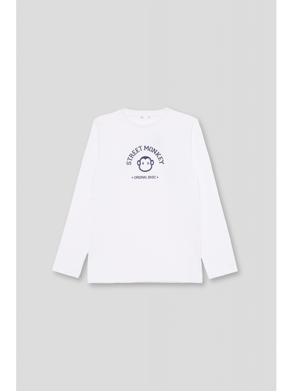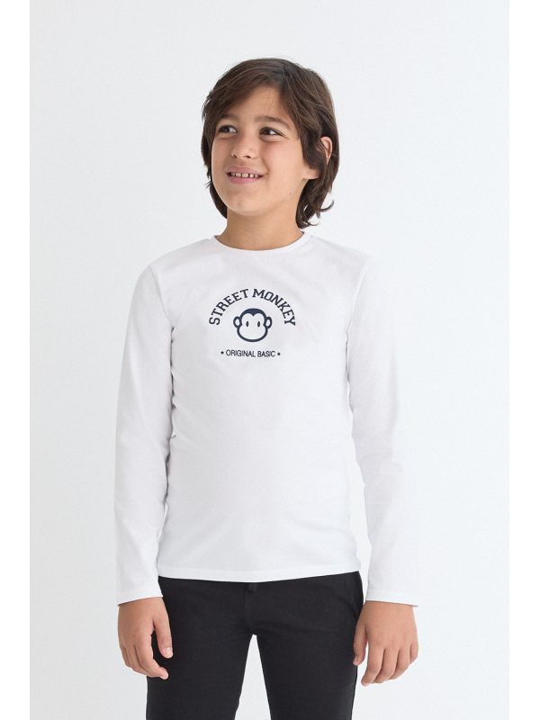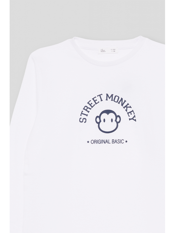 Camiseta para niño de 2 a 16 años disponible en varios colores: gris melange, azulina, blanco y marino. Esta camiseta de manga larga es perfecta para cualquier ocasión, combinando estilo y comodidad en un diseño divertido y versátil. Presenta el texto "Street Monkey Original Basic" acompañado de un simpático mono, añadiendo un toque de originalidad y encanto al atuendo de cualquier niño.