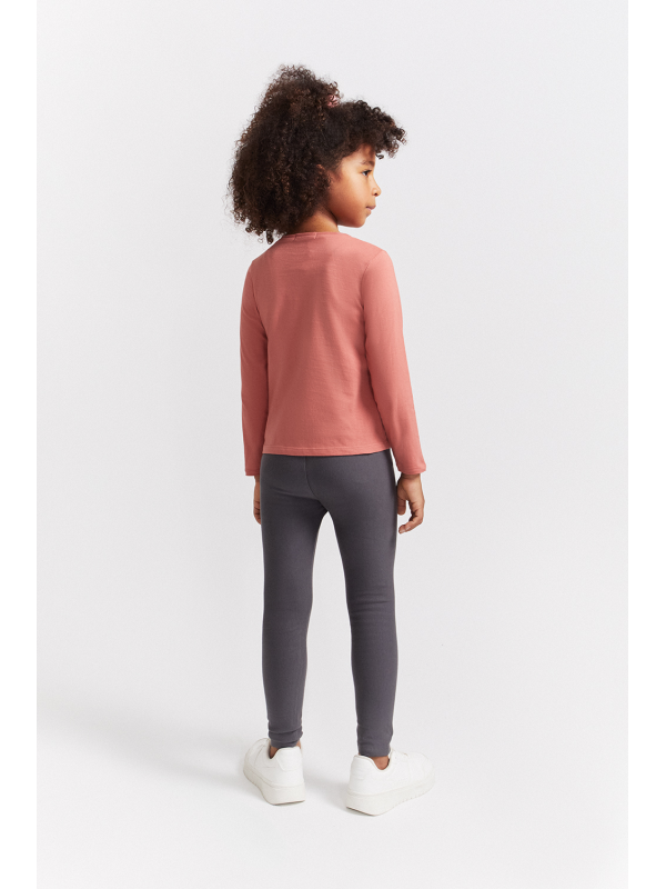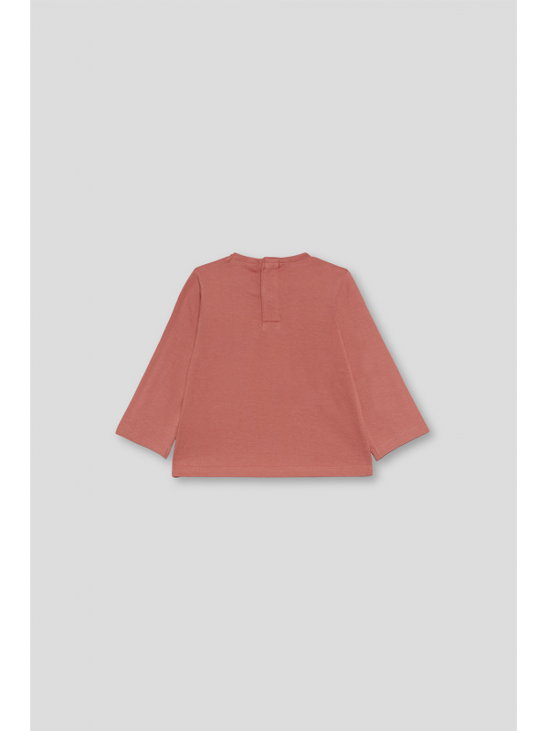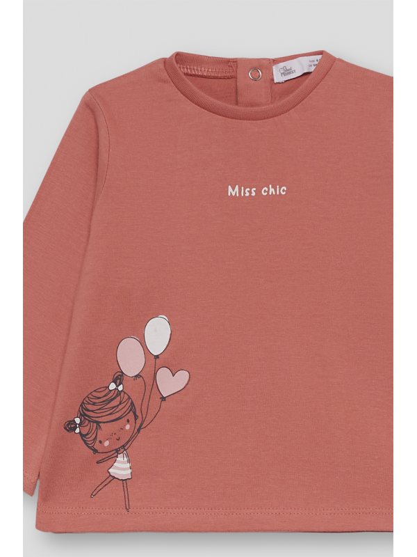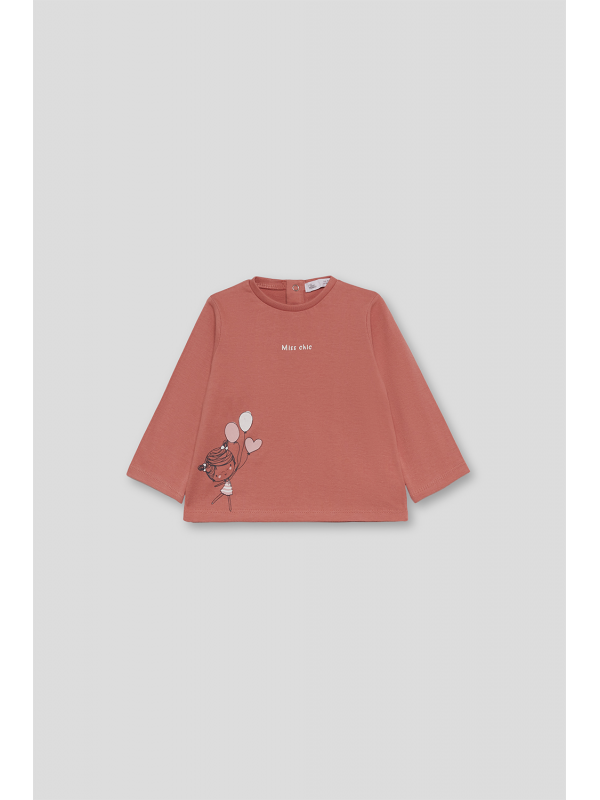 Camiseta de manga larga en color maquillaje con estampado decorativo en el bajo de una niña con globos y el texto "Miss chic" en el pecho. Cuello redondo y cierre con botones a presión en la espalda en las tallas más pequeñas para facilitar la puesta. Confeccionada en punto suave y elástico, perfecta para el día a día de las más pequeñas.