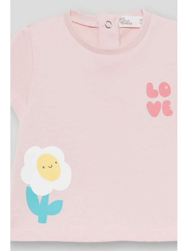 Diseño en color rosa claro con estampado de margarita sonriente y texto “LOVE”. Cuello redondo y cierre de botones en la espalda para mayor comodidad.