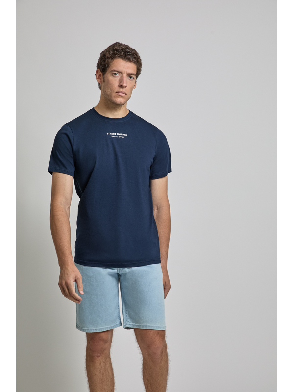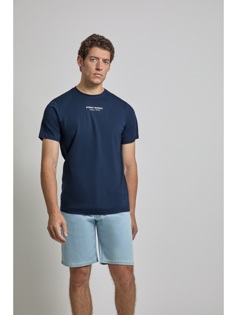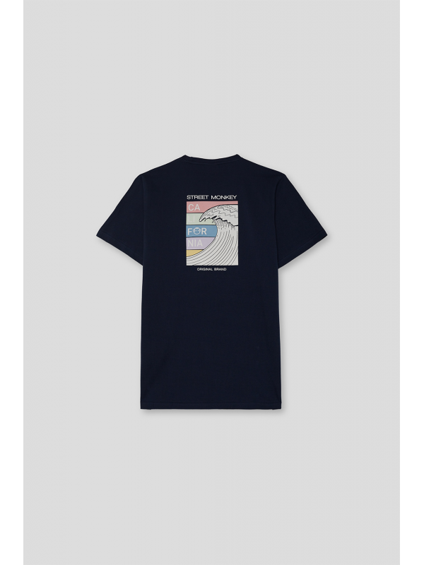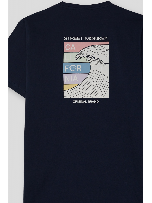 Camiseta de manga corta disponible en color marino. Diseño trasero con estampado “California Street Monkey” en tonos pastel.