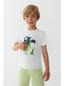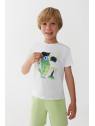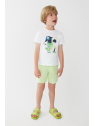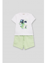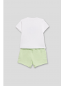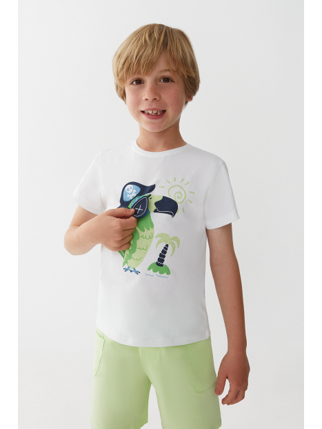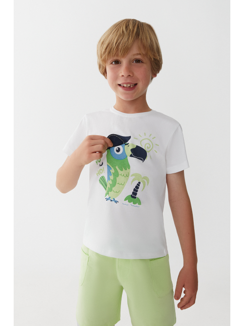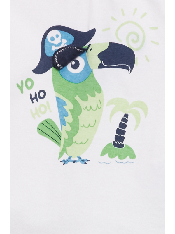 Conjunto de dos piezas, camiseta y shorts para bebé niño de 3 meses a 6 años. Camiseta blanca con divertido estampado de loro pirata en tonos verdes y azules, con un original detalle interactivo en el sombrero que añade un toque especial a la prenda. En las tallas de meses, cuenta con cierre de botones en el hombro para mayor practicidad. Shorts en color verde lima con cintura elástica y bolsillos funcionales, diseñados en un tejido ligero y fresco para ofrecer total libertad de movimiento. Un conjunto lleno de color y originalidad, perfecto para los pequeños aventureros del verano.