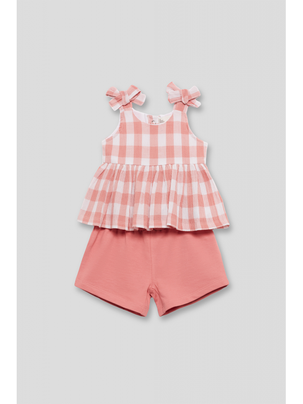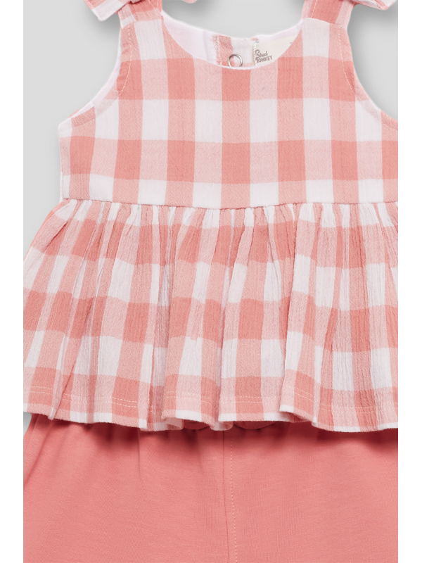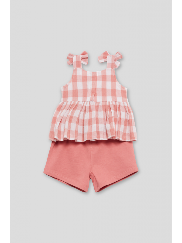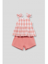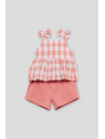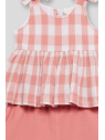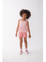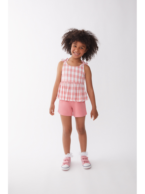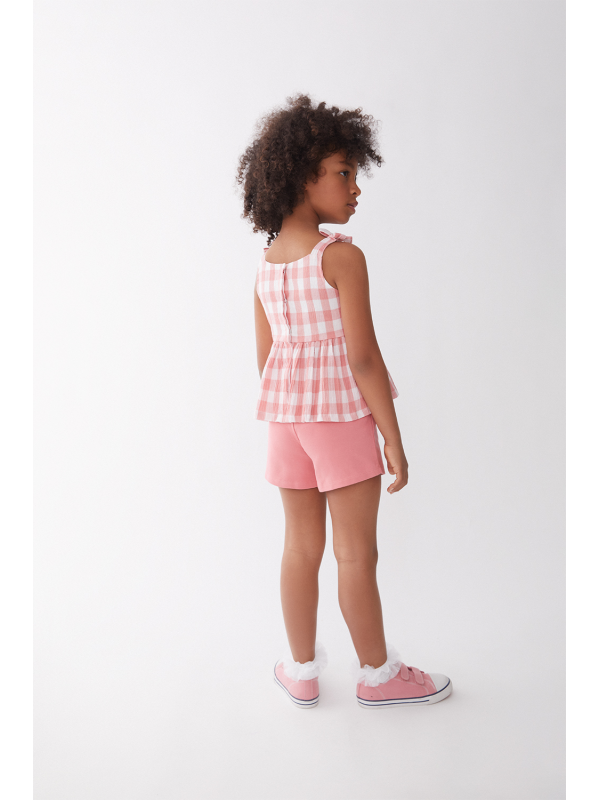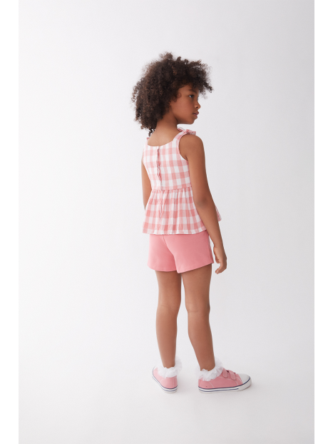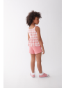 Camiseta de tirantes con cuadro vichy en tonos salmón y blanco, confeccionada en un tejido ligero y vaporoso. Diseño con detalle de lazos en los hombros y volante en la parte inferior, aportando un toque dulce y femenino.