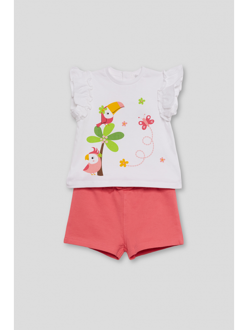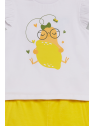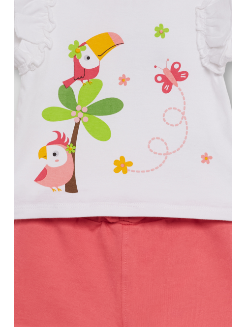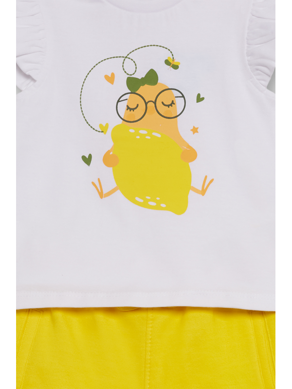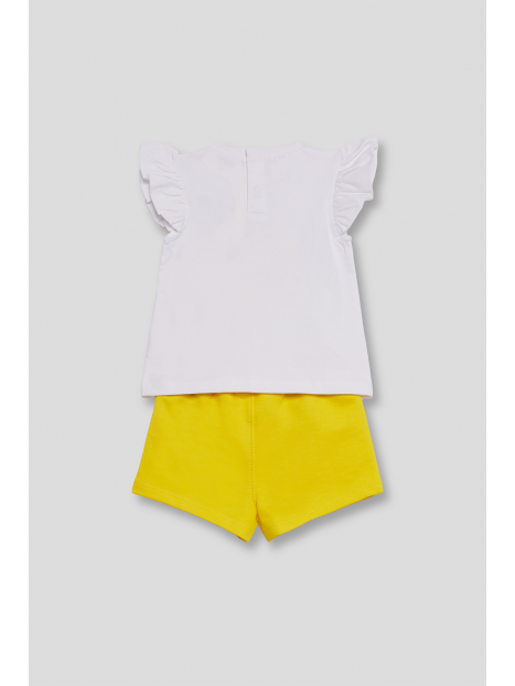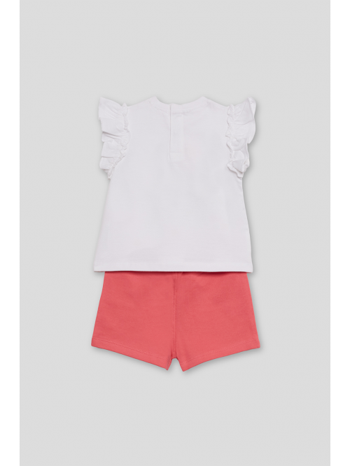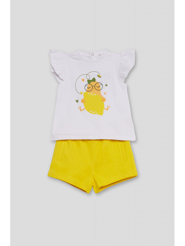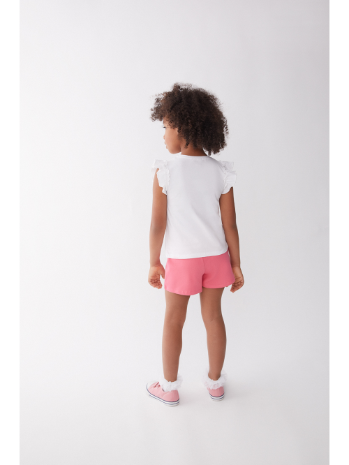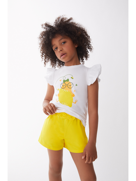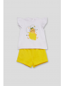 Camiseta blanca de manga corta con volantes en los hombros y un tierno estampado central de un pollito con gafas. Su diseño delicado y fresco es ideal para los días cálidos. En las tallas de meses, incluye cierre de botones en la espalda para facilitar la puesta.