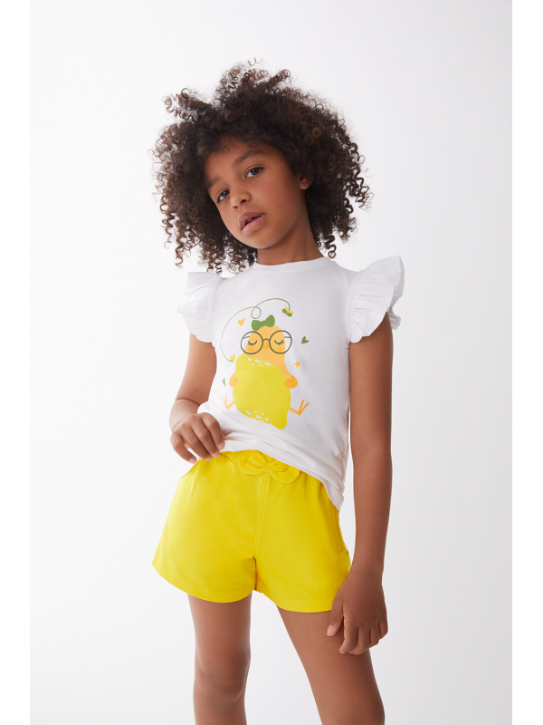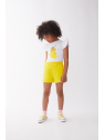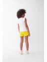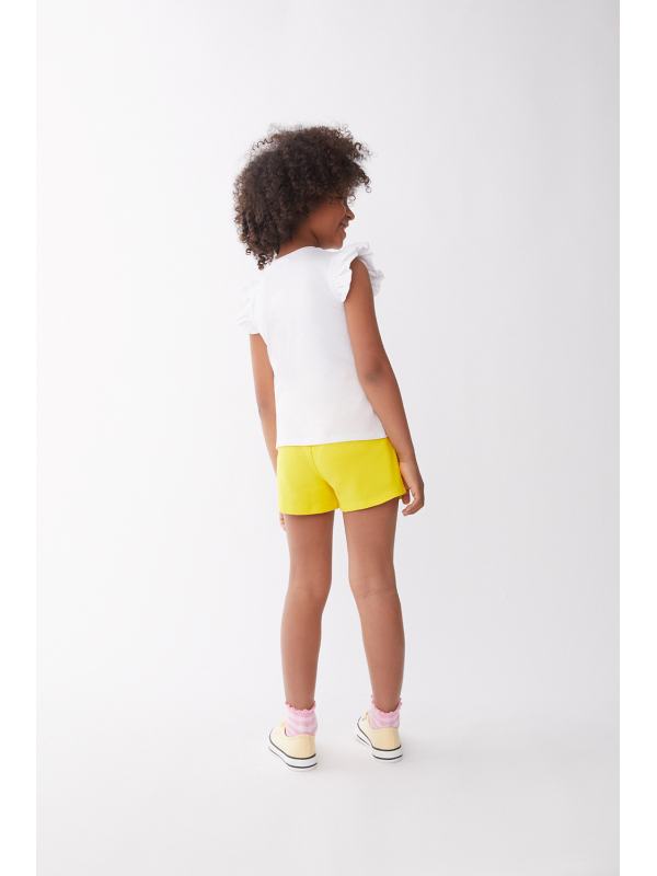 Shorts en color amarillo con cintura elástica de efecto fruncido y detalle de lazo decorativo en el centro. Corte cómodo y holgado, perfecto para el movimiento y la diversión durante el verano.
