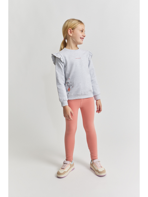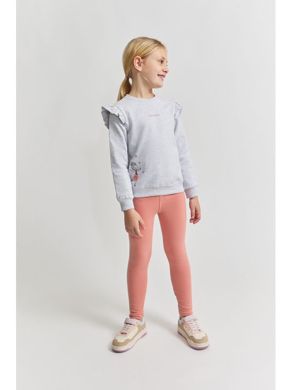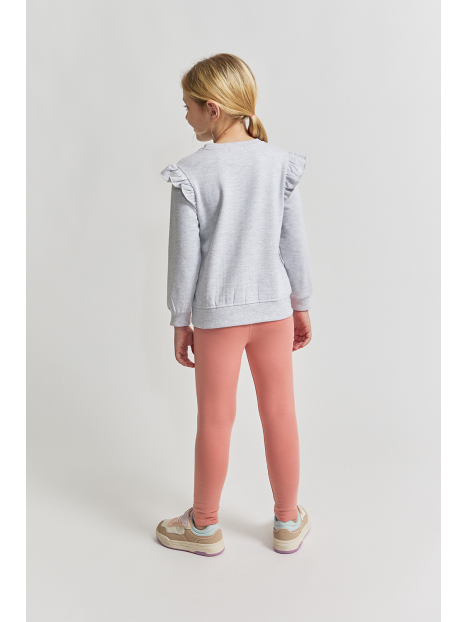 Conjunto de dos piezas, sudadera y leggings para bebé niña de 3 meses a 6 años. Conjunto de sudadera y leggings afelpado. La sudadera, en color gris vigoré claro, presenta un delicado volante en los hombros, estampado de bailarina en el bajo y la frase “Urban dancer” bordada en el pecho. Los puños y el bajo de canalé aseguran un ajuste cómodo y favorecedor. Leggings de punto en color maquillaje, de corte ajustado y cintura elástica. Las tallas de meses cuentan con cierre de botones en la espalda para facilitar el cambio.