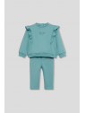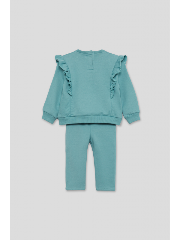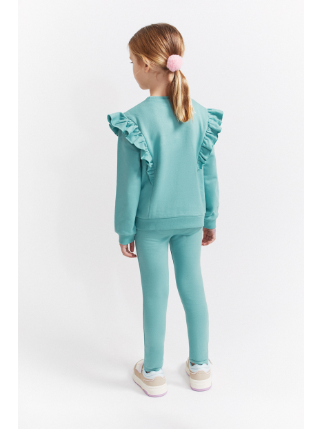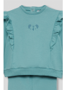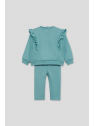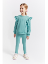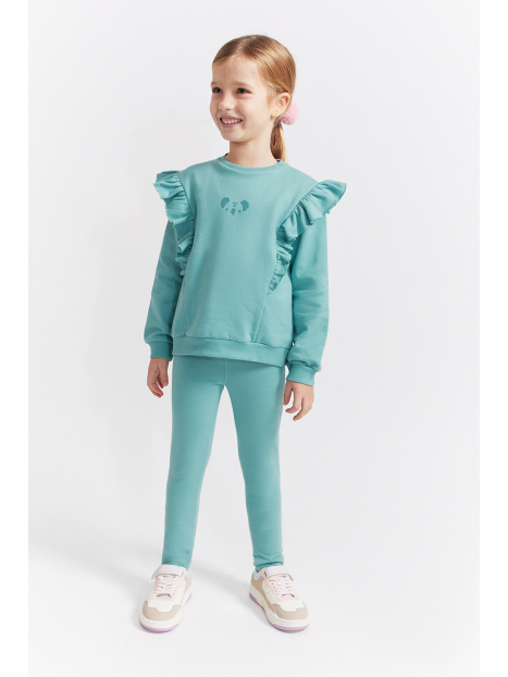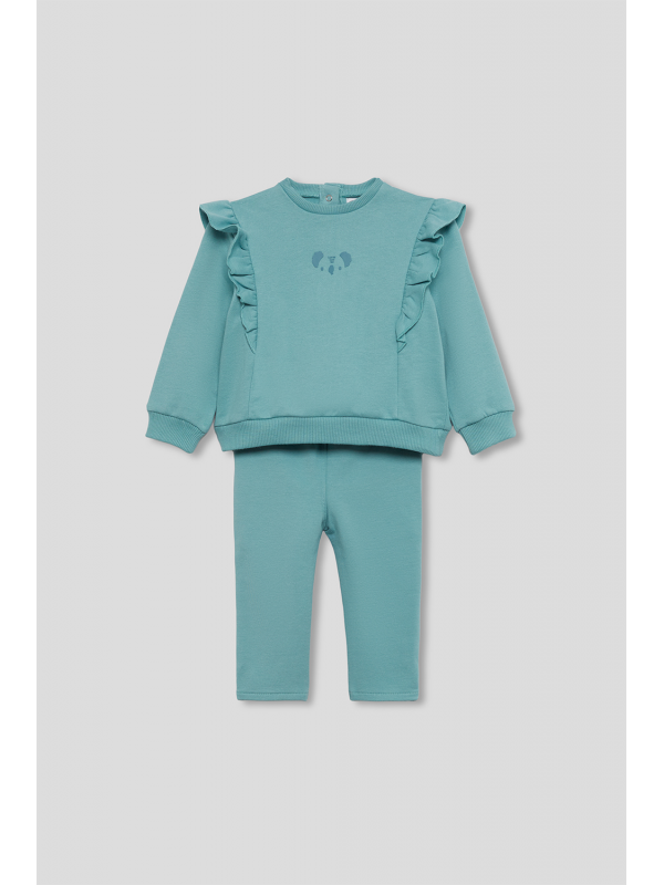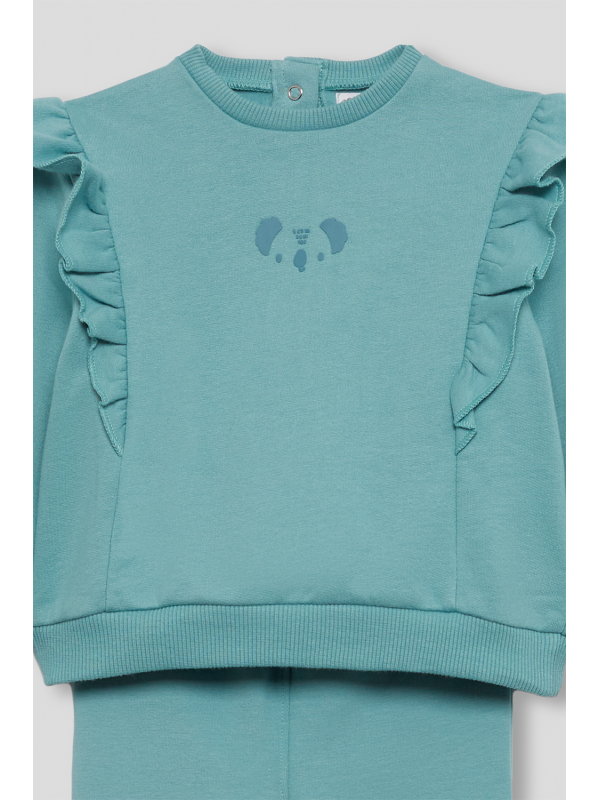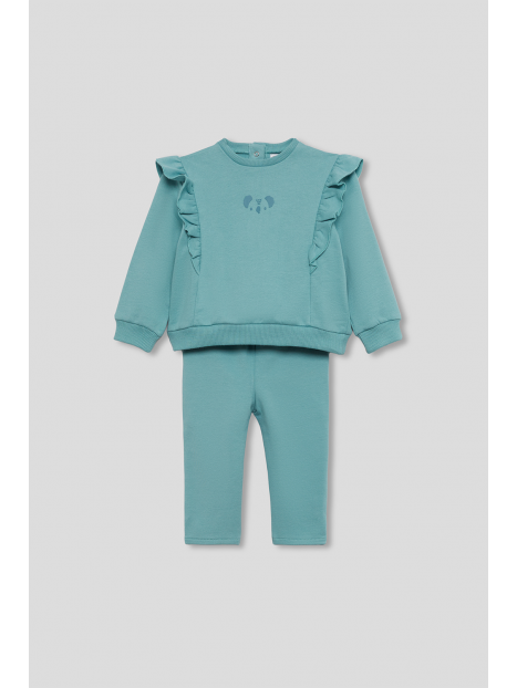 Sudadera en color verde amazonas con volantes decorativos desde los hombros hasta el pecho y pequeño estampado central de carita de koala a tono. Cuello redondo, puños ajustados y bajo recto con acabado en canalé. El conjunto se completa con leggings lisos a juego, con cinturilla elástica para mayor comodidad y libertad de movimiento. Confeccionado en felpa suave y cálida, ideal para el invierno.