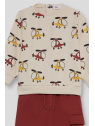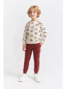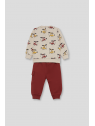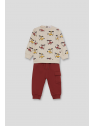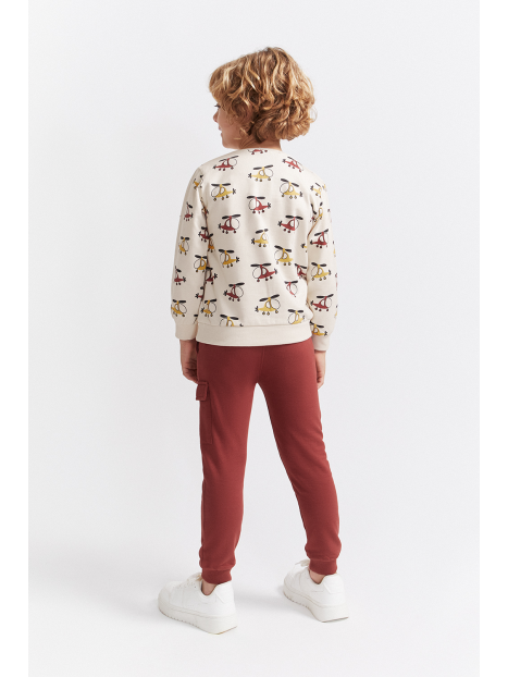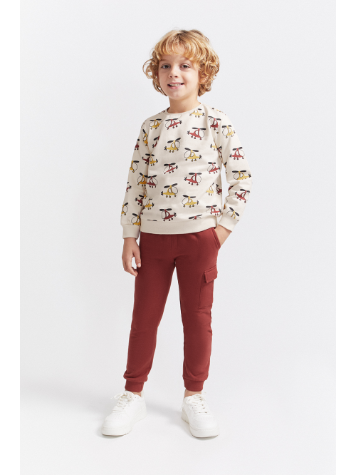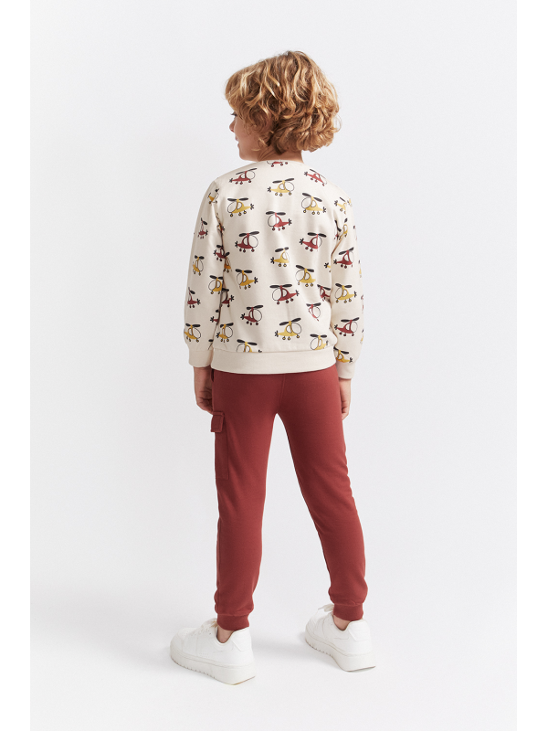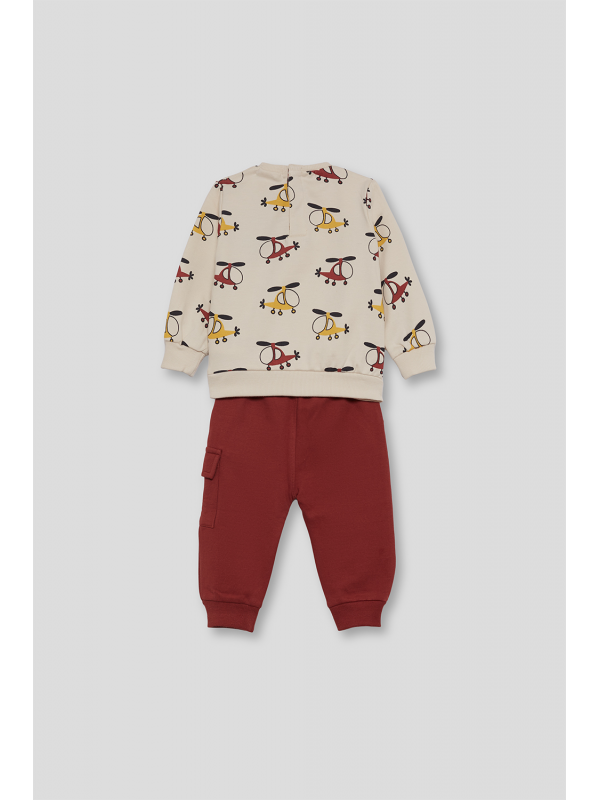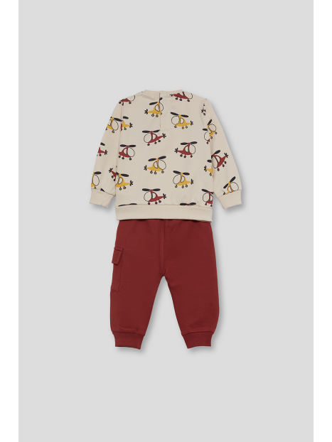 Sudadera en color crudo con original estampado de helicópteros en tonos mostaza, burdeos y gris oscuro. Cuello redondo, puños acanalados y apertura trasera con botones a presión en las tallas de meses para facilitar la puesta. El pantalón, de color burdeos, tiene cintura elástica con cordón ajustable y bolsillos tipo cargo en el lateral. Bajo con puño para un mejor ajuste.