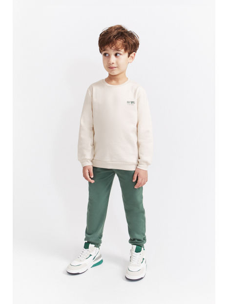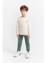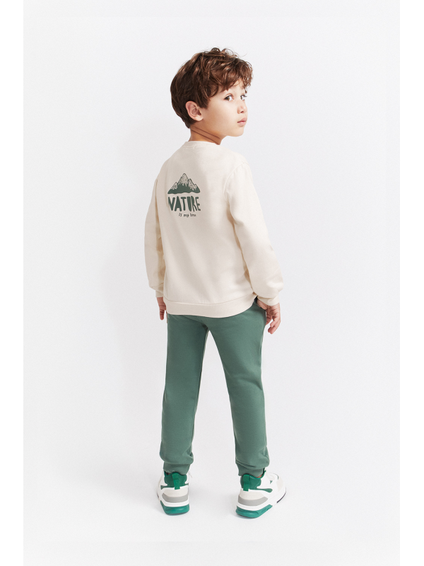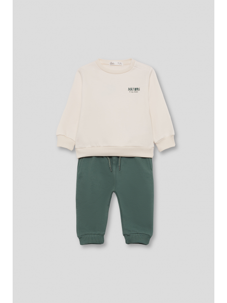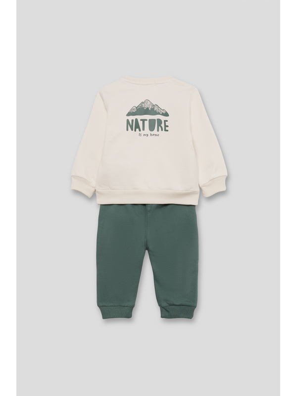 Sudadera de felpa perchada disponible en color crudo o caldera, con diseño montañoso en la espalda y mensaje “Nature is my home” estampado en la parte delantera. Cuello redondo, bajo y puños de canalé y apertura en el hombro con botones a presión en las tallas de meses. Se combina con pantalón tipo jogger en color azul noche o verde amazonas, con cintura elástica y cordón decorativo a contraste. Un conjunto suave y cálido para disfrutar del invierno con estilo y comodidad.