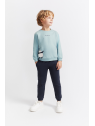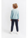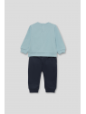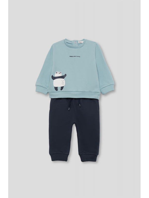 Disponible en dos colores, celeste o caldera, con sudadera de felpa perchada, cuello redondo, puños de canalé y cierre de botones a presión en la espalda en las tallas más pequeñas. Lleva un divertido estampado de oso panda en el bajo y la frase “Happy and funny” bordada en el pecho. El pantalón a juego, en color azul noche, incorpora cintura elástica con cordón ajustable y bajos acanalados.