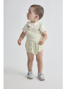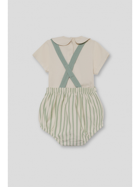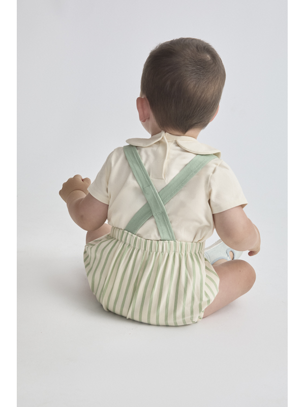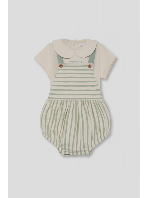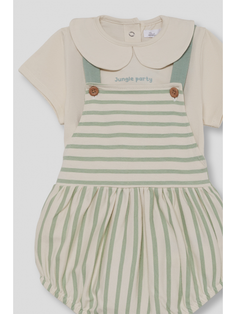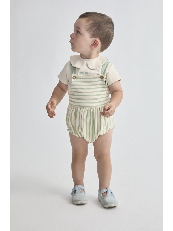 Camiseta cruda con cuello bebé y detalle bordado "Jungle Party". Ranita de tirantes cruzados en la espalda con estampado de rayas verdes y botones decorativos en el frontal. Cierre a presión en la espalda y entrepierna para mayor comodidad. Tejido suave y fresco, perfecto para los días de verano.