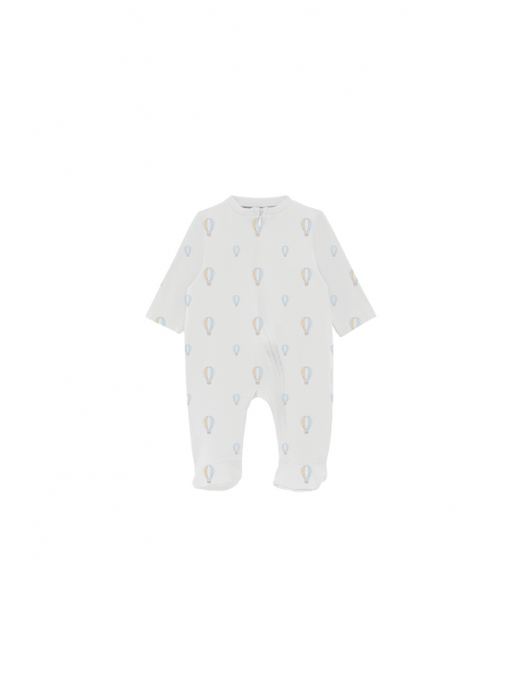 En color blanco y celeste con estampado de globos en tonos celeste y amarillo. Diseño de manga larga y cuello redondo, con cierre de cremallera frontal hasta el bajo para facilitar el cambio.