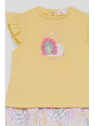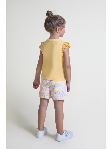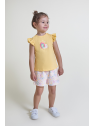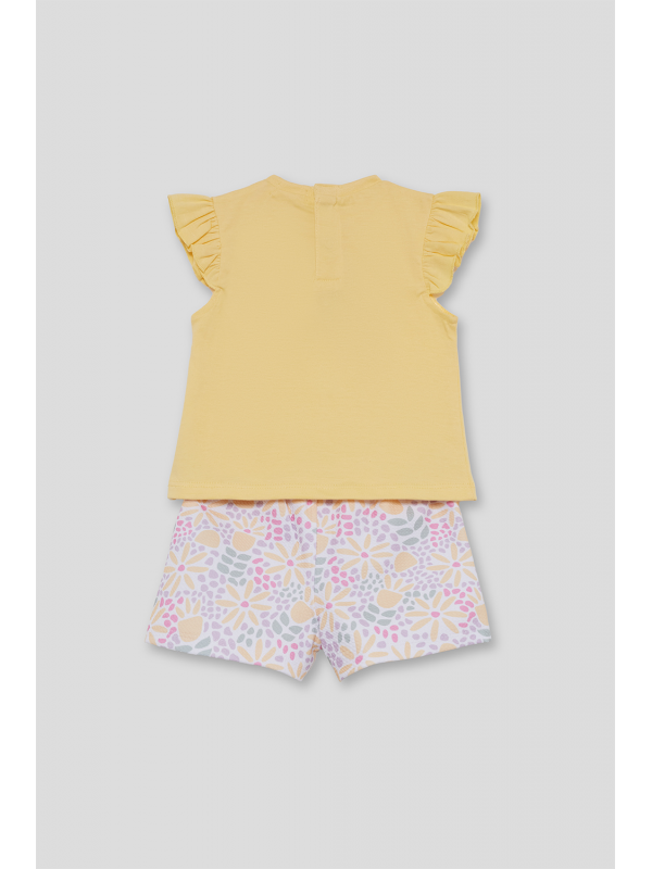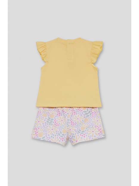 Conjunto de dos piezas, camiseta y shorts para bebé niña de 3 meses a 6 años. Camiseta amarilla con volantes en las mangas y estampado central con relieve. Shorts en color crudo con estampado floral multicolor. Tejido cómodo y fresco, ideal para verano.