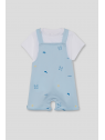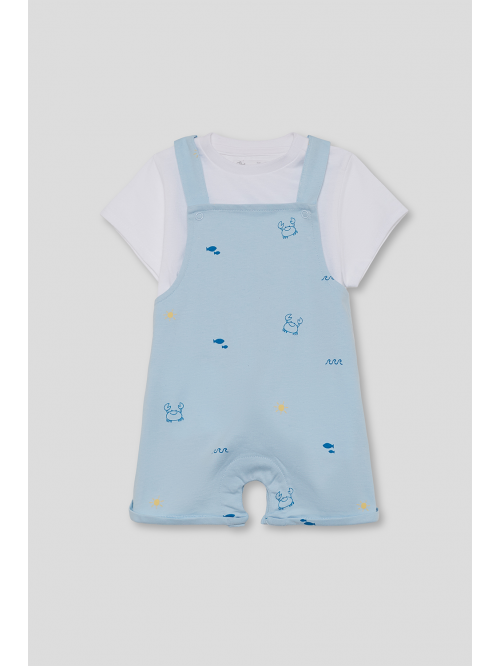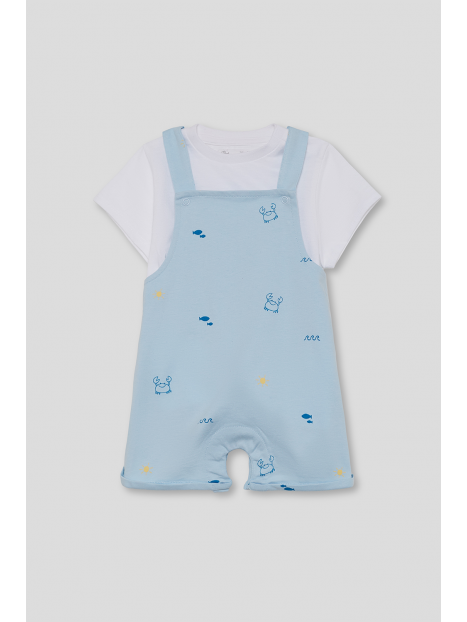 Conjunto de dos piezas, camiseta y peto para bebé niño de 3 meses a 6 años. Camiseta blanca de manga corta. Peto corto en color azul con tirantes y estampado de cangrejos, peces y soles en contraste. Confeccionado en algodón suave y transpirable, perfecto para los días de verano.
