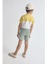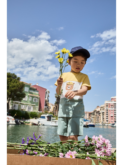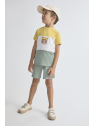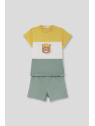 Camiseta de manga corta a rayas anchas en mostaza, blanco y verde, con estampado frontal de oso y detalle “Camping Days”. Shorts en color verde con cintura elástica y bolsillos.