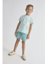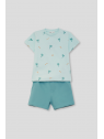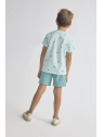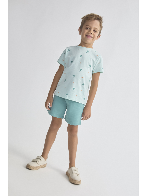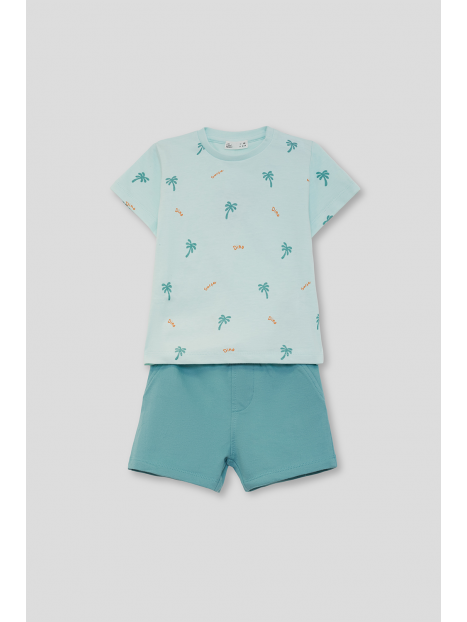 Conjunto de dos piezas, camiseta y shorts para niño de 3 meses a 6 años. Camiseta verde agua de manga corta con estampado all over de palmeras y textos decorativos. Shorts en color verde con cintura elástica y bolsillos delanteros.