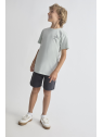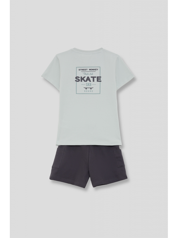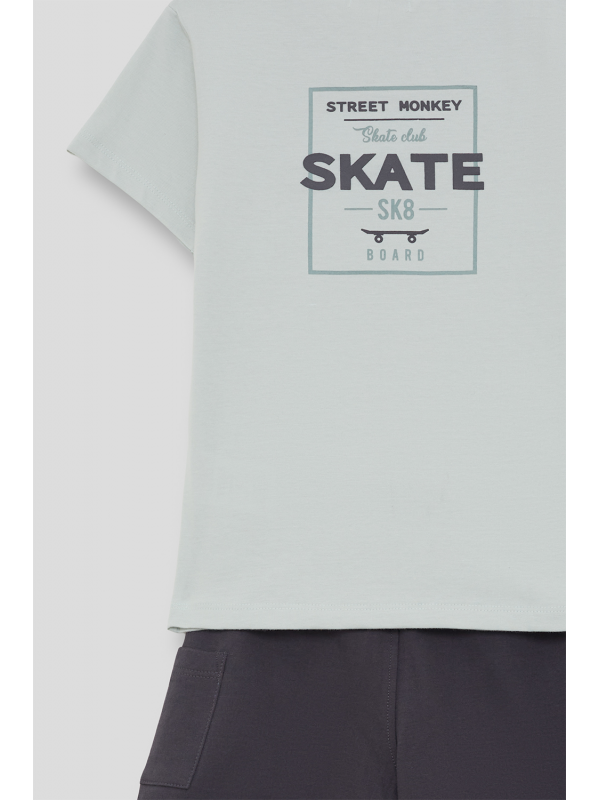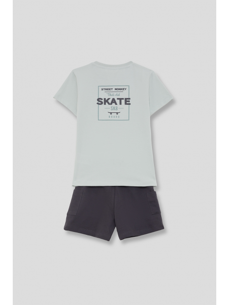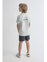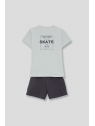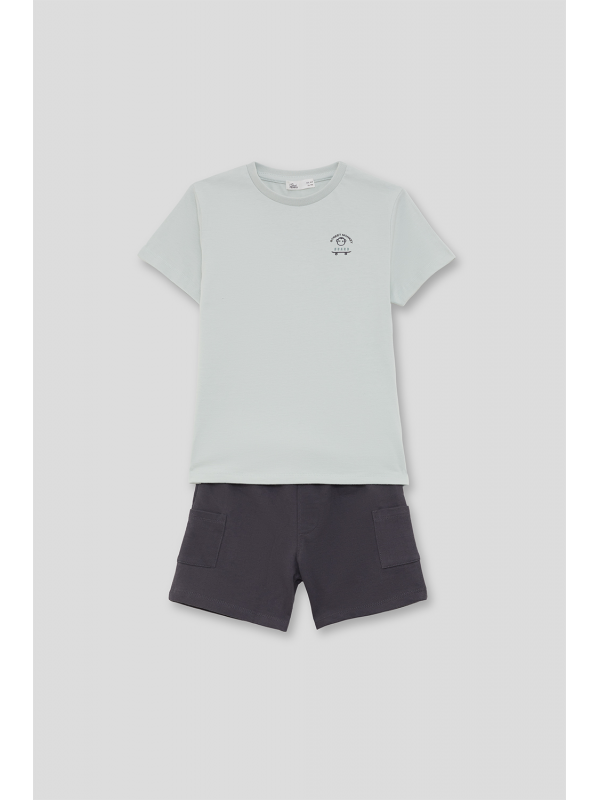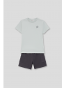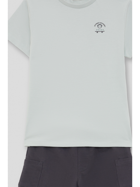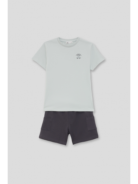 Camiseta en color verde agua con estampado pequeño en el pecho y shorts en color marino con bolsillos laterales. Confeccionado en algodón suave para mayor comodidad.