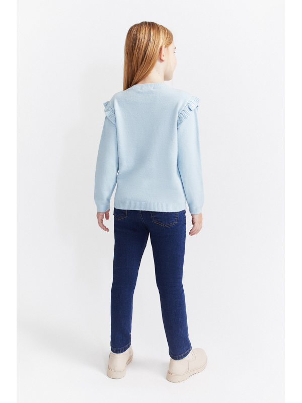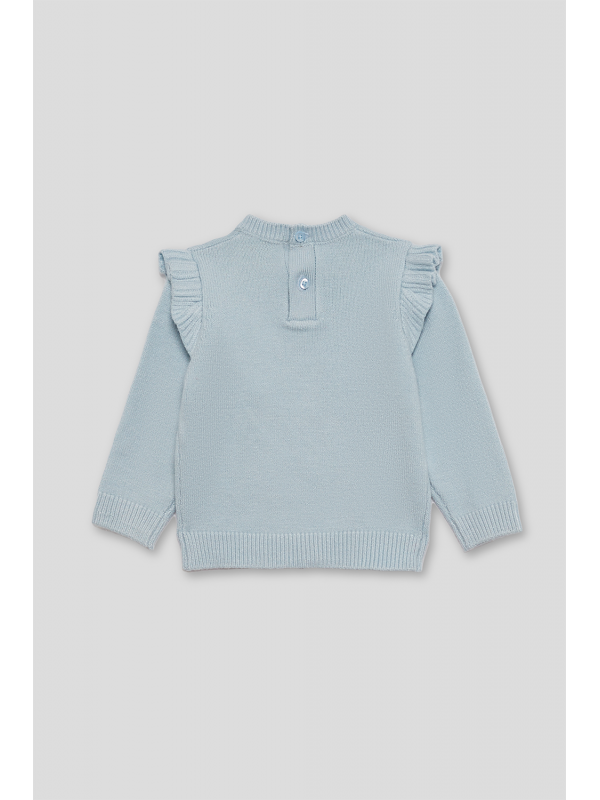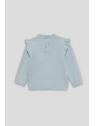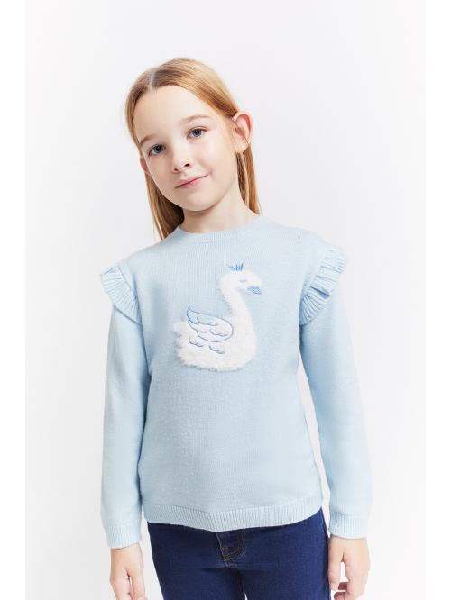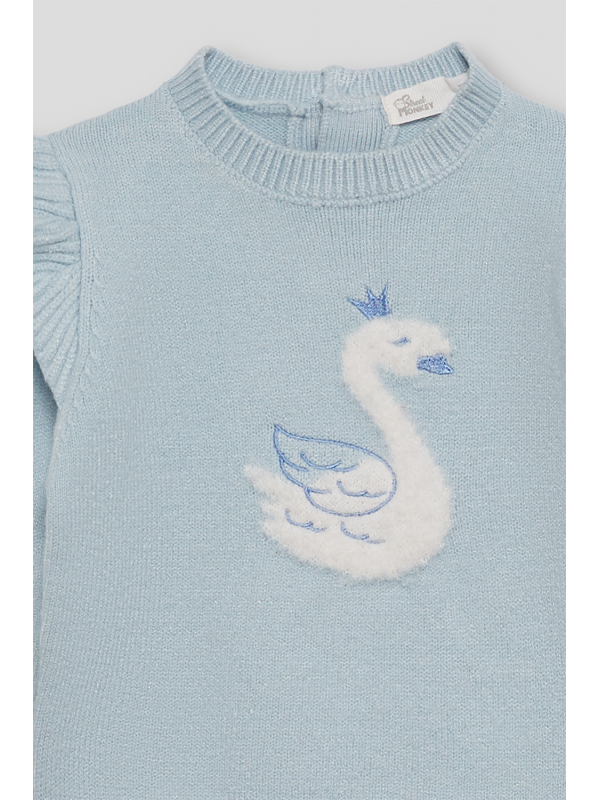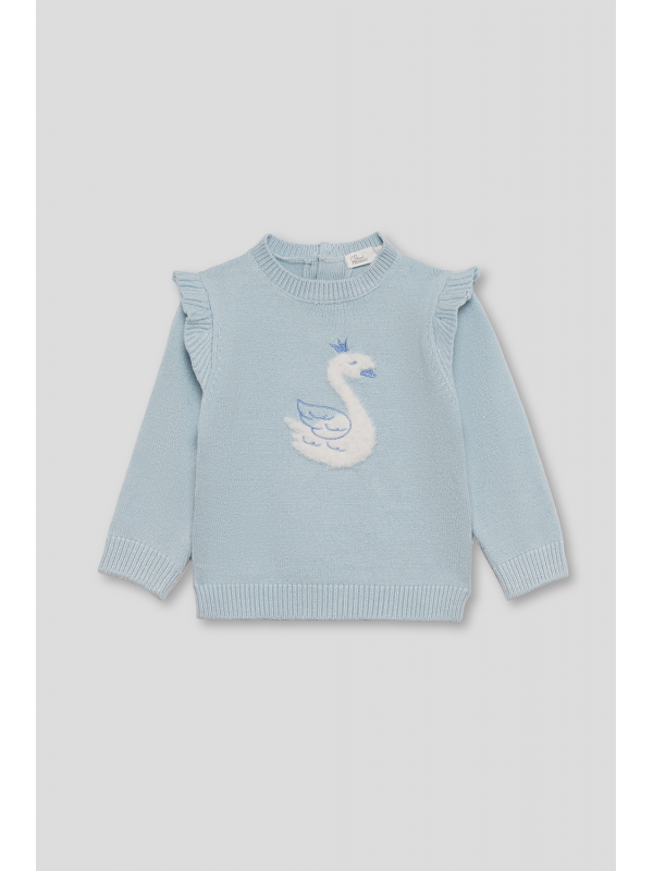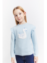Jersey de manga larga en color azulina, confeccionado en punto suave y cálido para los días de invierno. En el frontal destaca un delicado cisne blanco con corona, bordado con detalles en relieve que aportan textura y ternura al diseño. Los volantes de canalé en los hombros le dan un toque especial y femenino.