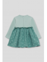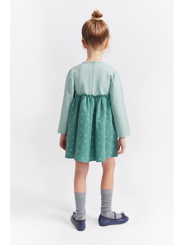 Vestido de manga larga en tonos verdes, diseñado para ofrecer calidez y dulzura en los días de invierno. El cuerpo liso en color verde agua contrasta con la falda fruncida en tono verde más intenso, decorada con un delicado estampado floral en blanco. El corte bajo el pecho aporta volumen y movimiento, mientras que el tejido afelpado garantiza una sensación suave y confortable.