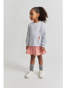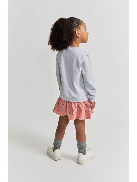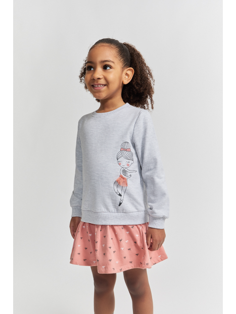 Vestido sudadera con falda estampada para bebé niña de 3 meses a 6 años. Vestido de manga larga confeccionado en suave tejido afelpado, ideal para el invierno. La parte superior en color gris vigoré claro presenta un estampado de bailarina con detalles bordados y pompón decorativo que aporta volumen y ternura. El cuello redondo y los acabados de canalé en puños y bajo aseguran un ajuste cómodo. La falda integrada, en color maquillaje con estampado de pequeños lacitos en contraste, añade movimiento y un toque divertido al diseño. En las tallas de meses incorpora cierre de botones en la espalda para facilitar la puesta. Un vestido cómodo y coqueto que combina estilo y libertad de movimiento para el día a día.