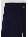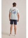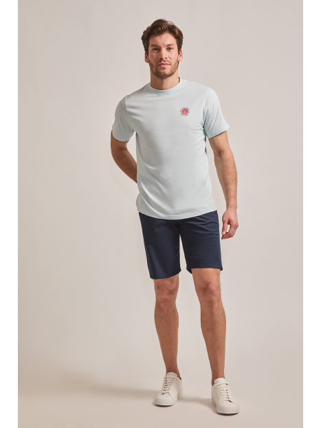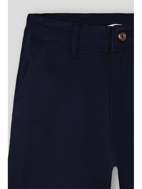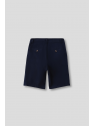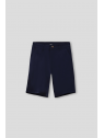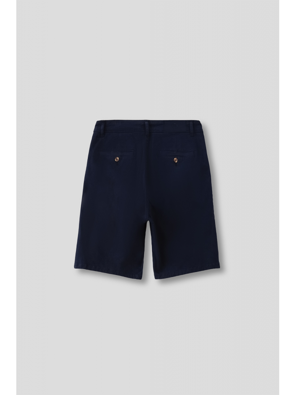 Bermuda estilo chino con cinco bolsillos. Cierre central mediante botón y cremallera, fornituras personalizadas y etiqueta en efecto piel en la cinturilla.