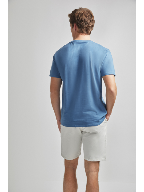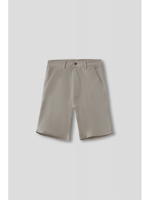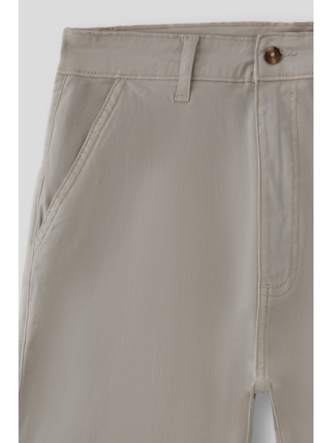 Bermuda estilo chino con cinco bolsillos. Cierre central mediante botón y cremallera, fornituras personalizadas y etiqueta en efecto piel en la cinturilla.