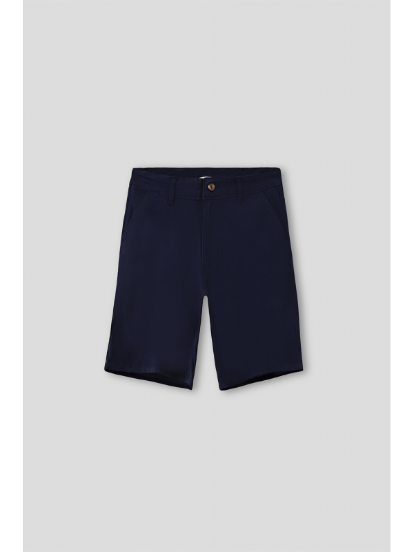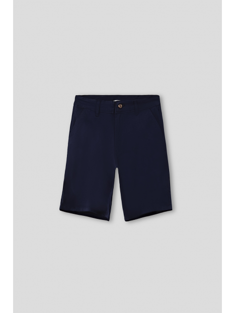 Bermuda estilo chino con cinco bolsillos. Cierre central mediante botón y cremallera, fornituras personalizadas y etiqueta en efecto piel en la cinturilla.