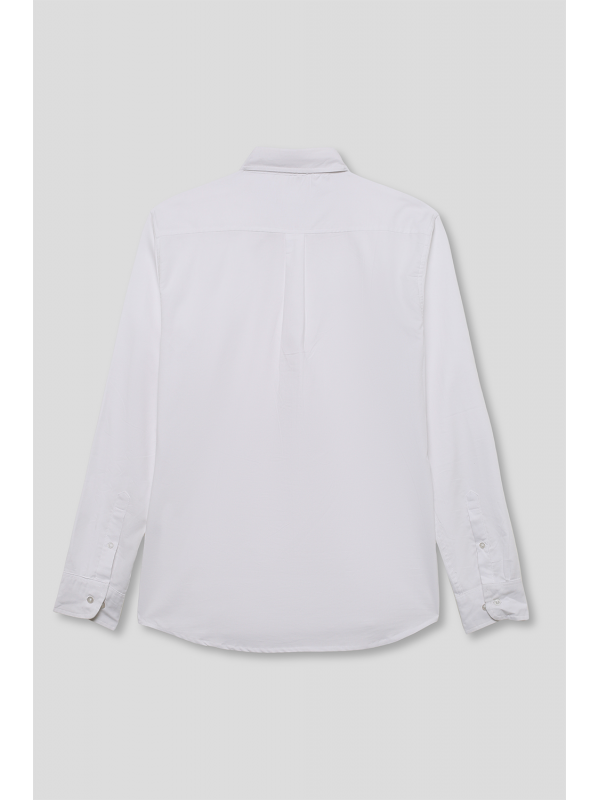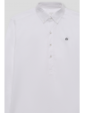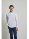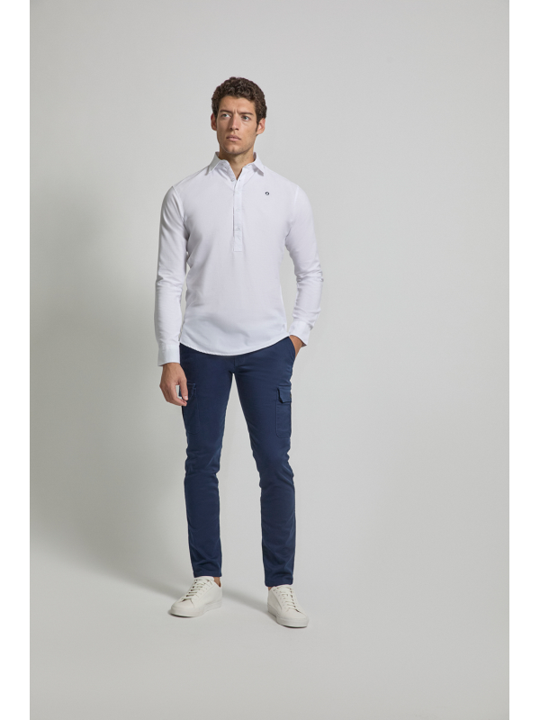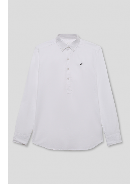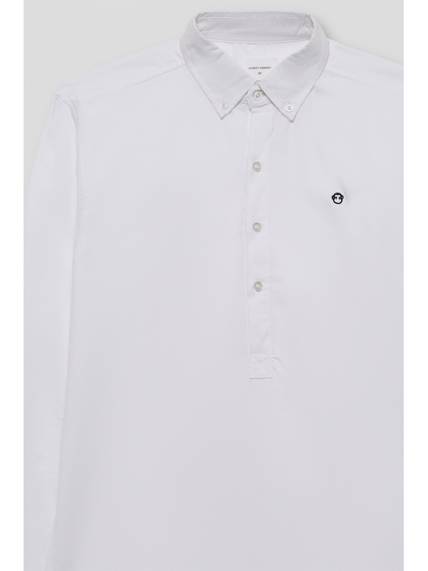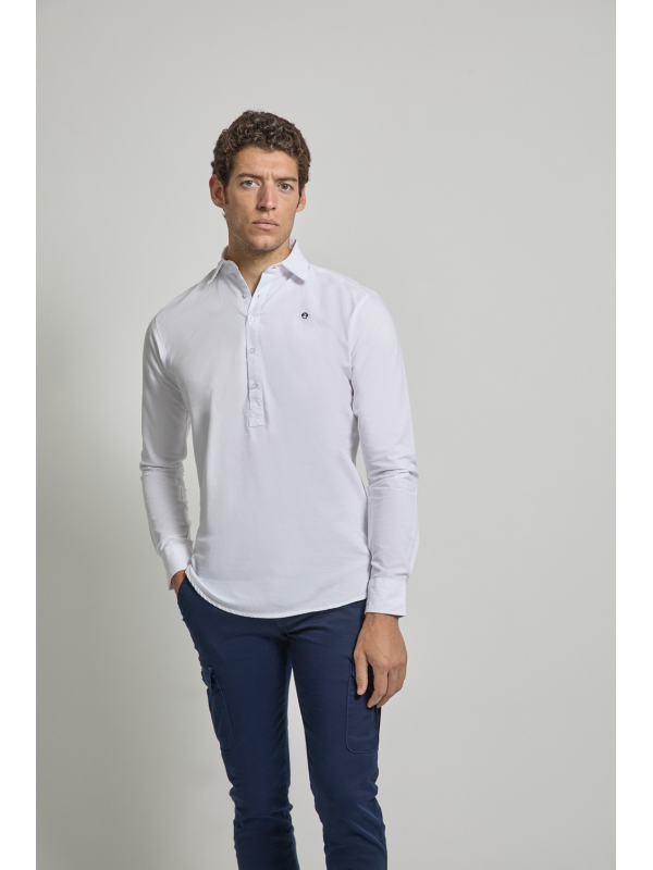 Camisa de manga larga tipo polo para hombre. Diseño liso con cuello abierto y tapeta de botones, confeccionada en tejido ligero y cómodo.