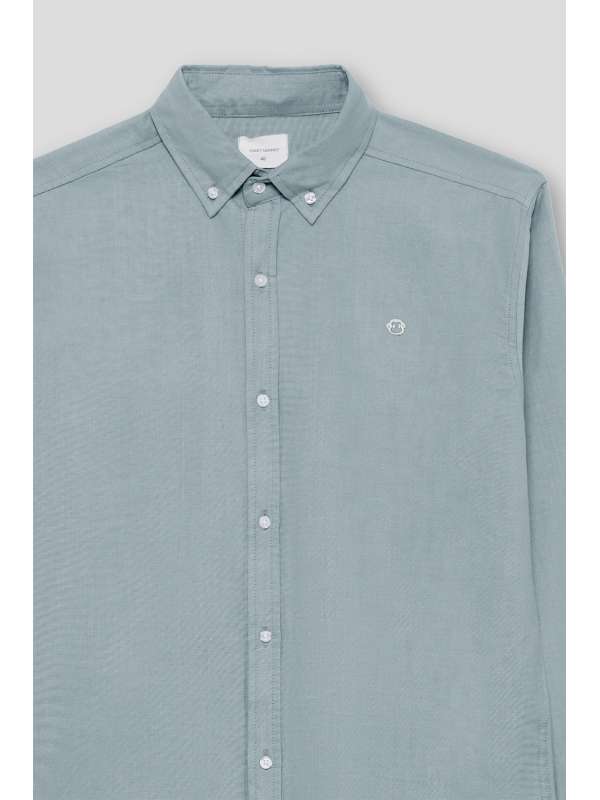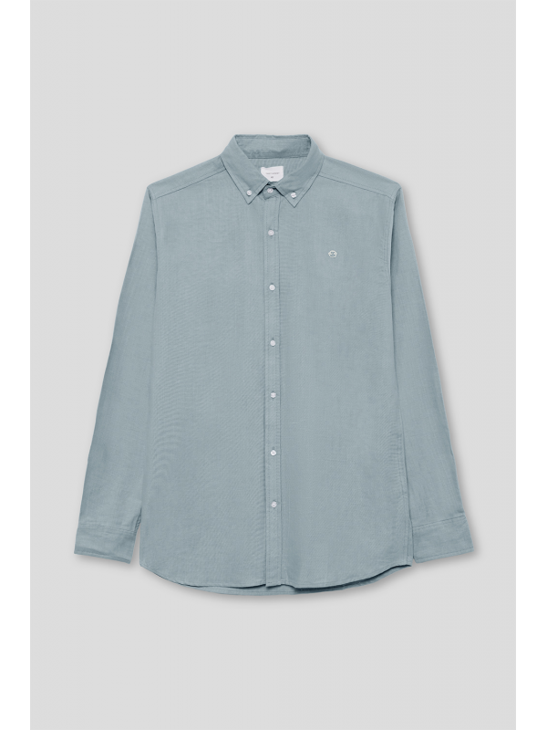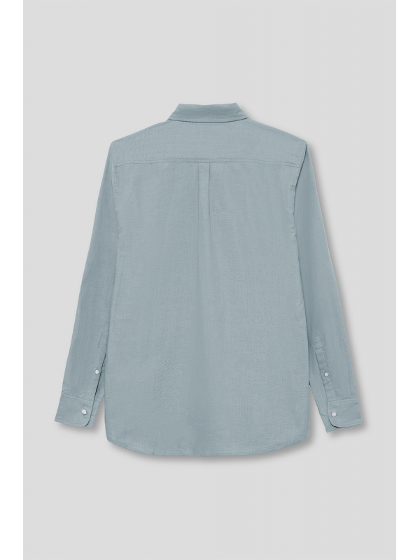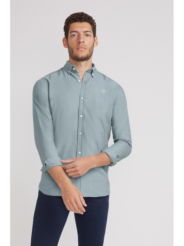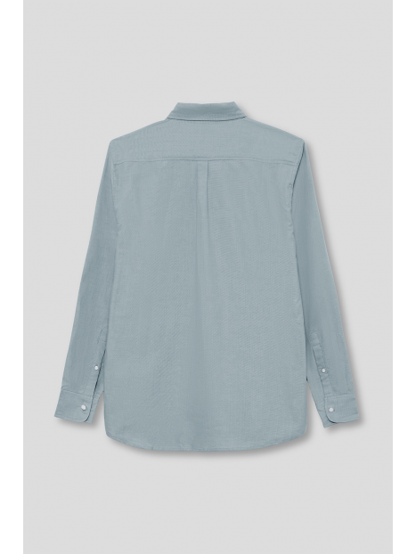 Camisa de manga larga para hombre en color azul claro. Diseño liso con cuello button down, cierre frontal de botones y tejido ligero de tacto suave.